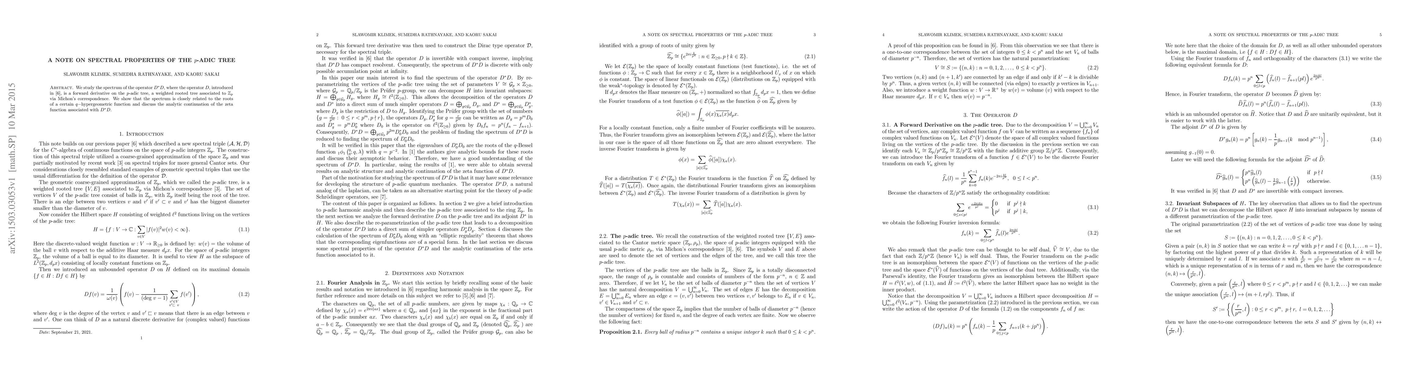 We study the spectrum of the operator $D^*D$, where the operator $D$, introduced in \cite{KMR}, is a forward derivative on the $p$-adic tree, a weighted rooted tree associated to $\mathbb Z_p$ via Michon's correspondence. We show that the spectrum is closely related to the roots of a certain $q-$hypergeometric function and discuss the analytic continuation of the zeta function associated with $D^*D$.