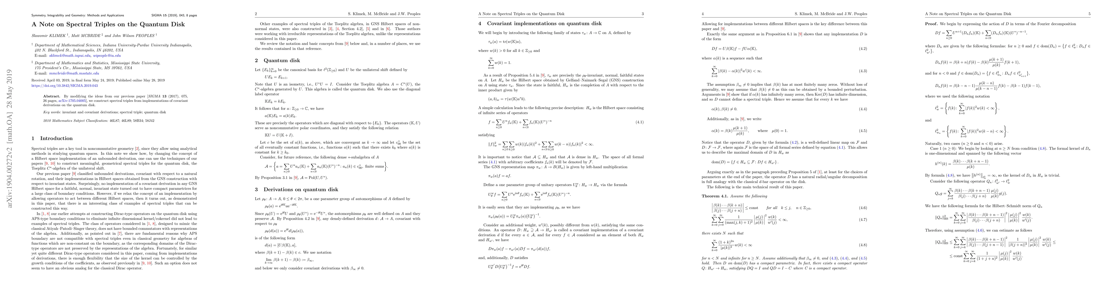 Summary: This paper builds on prior work to construct spectral triples using covariant derivations on the quantum disk, enhancing the understanding of quantum geometry in this context. The methodology provides a new framework for analyzing the spectral properties of quantum spaces.