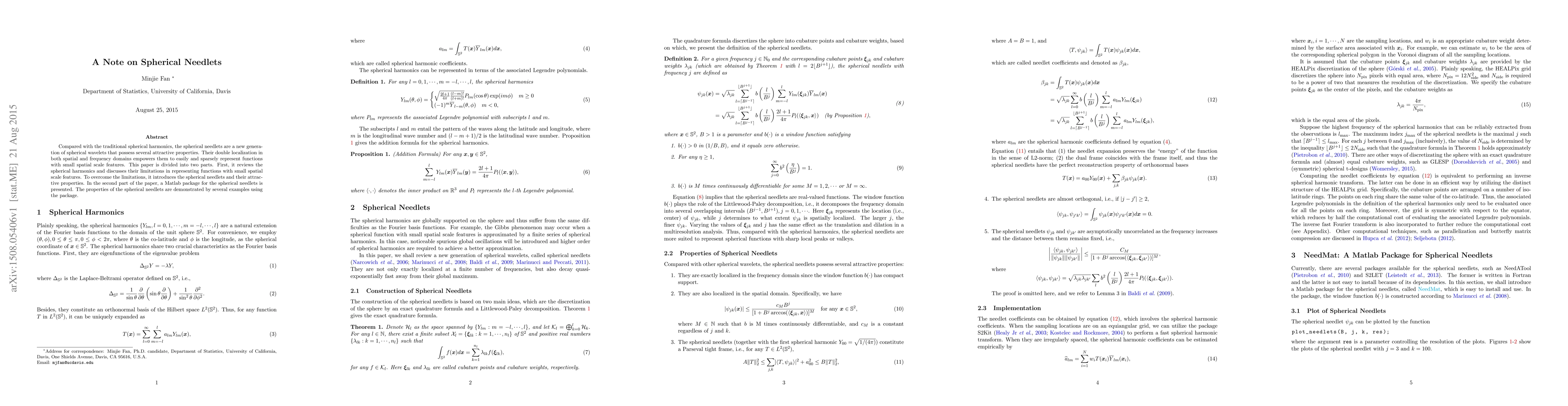 Compared with the traditional spherical harmonics, the spherical needlets are a new generation of spherical wavelets that possess several attractive properties. Their double localization in both spatial and frequency domains empowers them to easily and sparsely represent functions with small spatial scale features. This paper is divided into two parts. First, it reviews the spherical harmonics and discusses their limitations in representing functions with small spatial scale features. To overcome the limitations, it introduces the spherical needlets and their attractive properties. In the second part of the paper, a Matlab package for the spherical needlets is presented. The properties of the spherical needlets are demonstrated by several examples using the package.