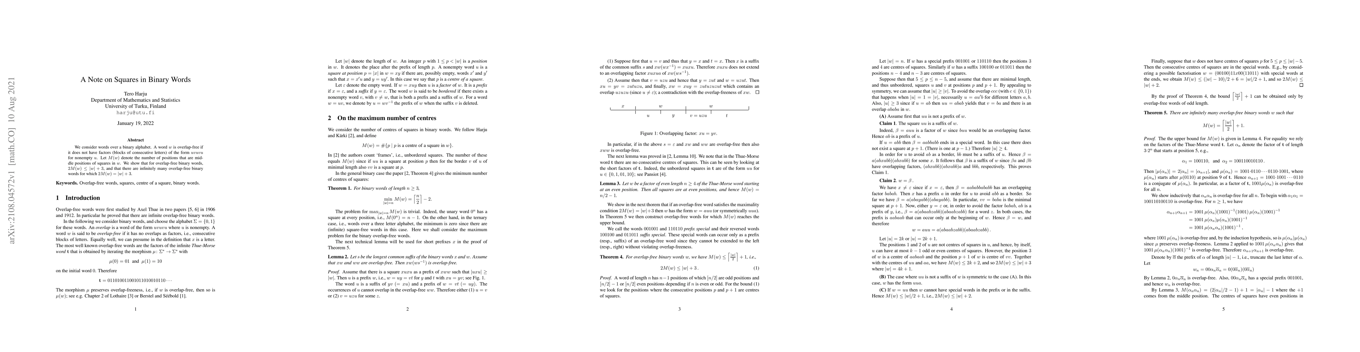 This paper investigates overlap-free binary words, proving that for such words, the number of middle positions of squares is at most half the word length plus three. It also demonstrates the existence of infinitely many such words achieving this upper bound.