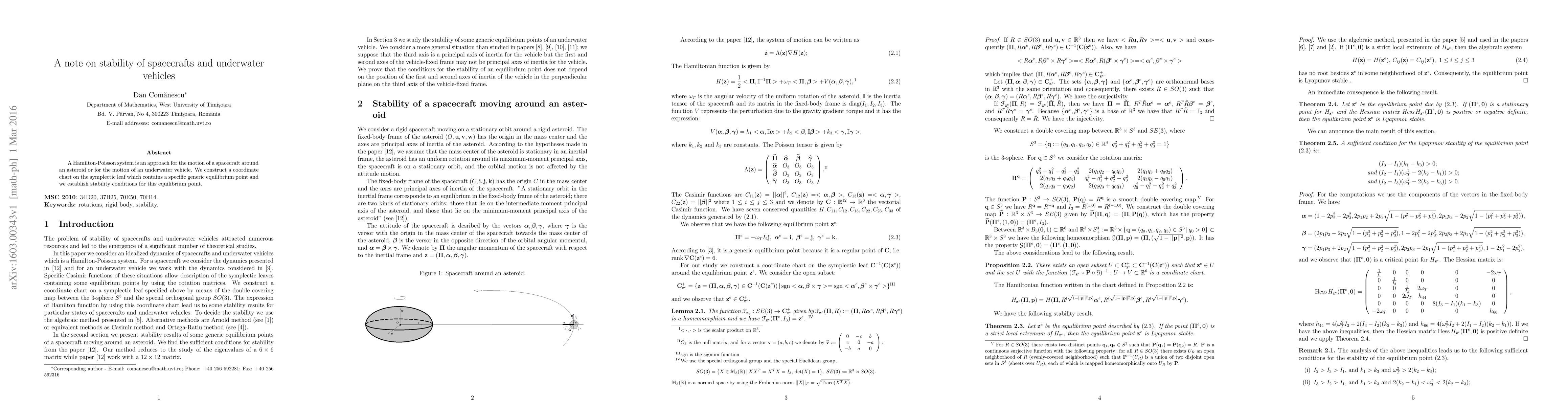 This paper explores the stability of spacecrafts and underwater vehicles using a Hamilton-Poisson system. It constructs a coordinate chart around a specific equilibrium point and establishes conditions for its stability.