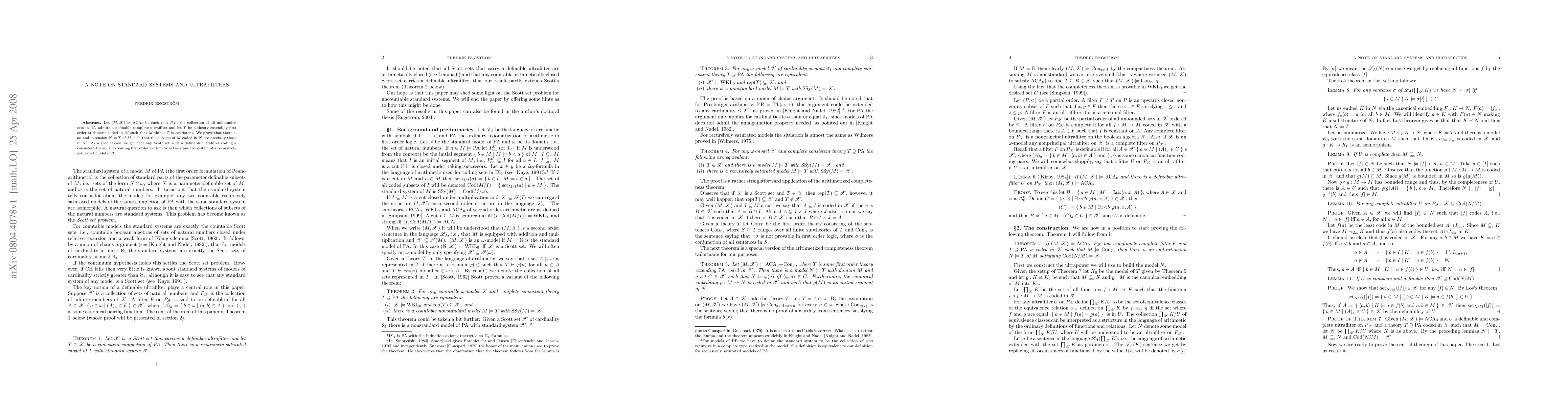Let $(M,\scott X) \models \ACA$ be such that $P_\scott X$, the collection of all unbounded sets in $\scott X$, admits a definable complete ultrafilter and let $T$ be a theory extending first order arithmetic coded in $\scott X$ such that $M$ thinks $T$ is consistent. We prove that there is an end-extension $N \models T$ of $M$ such that the subsets of $M$ coded in $N$ are precisely those in $\scott X$. As a special case we get that any Scott set with a definable ultrafilter coding a consistent theory $T$ extending first order arithmetic is the standard system of a recursively saturated model of $T$.
