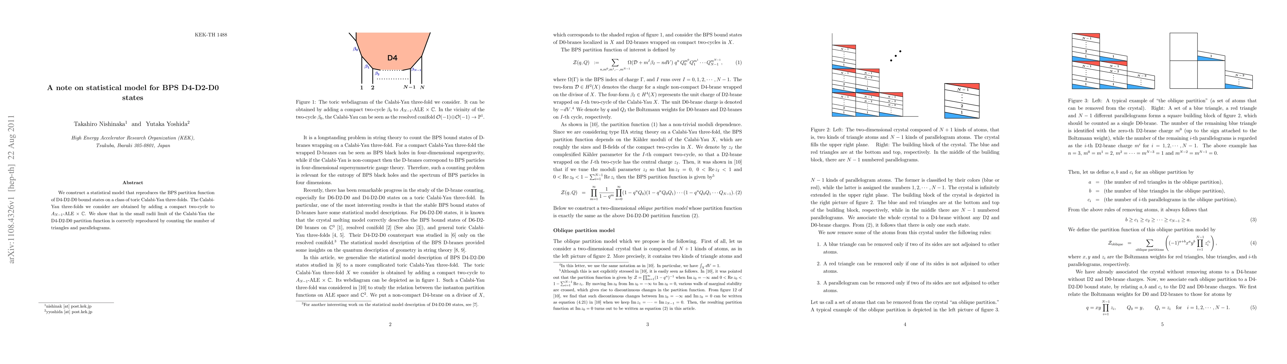 This paper constructs a statistical model to replicate the BPS partition function for D4-D2-D0 bound states on specific toric Calabi-Yau three-folds. The model accurately reproduces the partition function by counting triangles and parallelograms in the small radii limit.