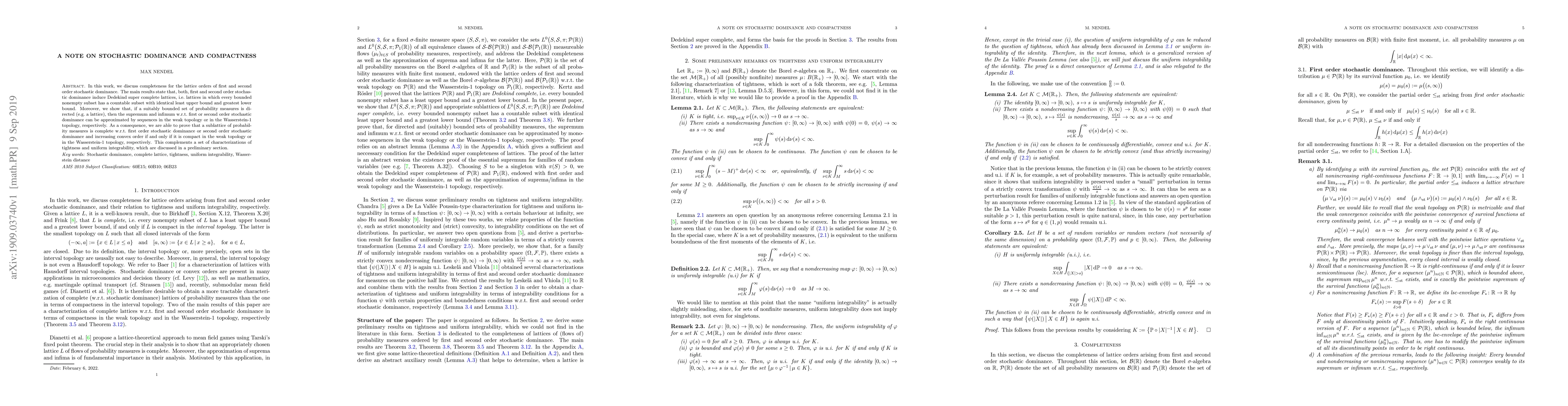 This paper explores the completeness of lattice orders for first and second order stochastic dominance, demonstrating that both induce Dedekind super complete lattices. It further proves that a sublattice of probability measures is complete under these stochastic dominance orders if and only if it is compact in the weak or Wasserstein-1 topology.