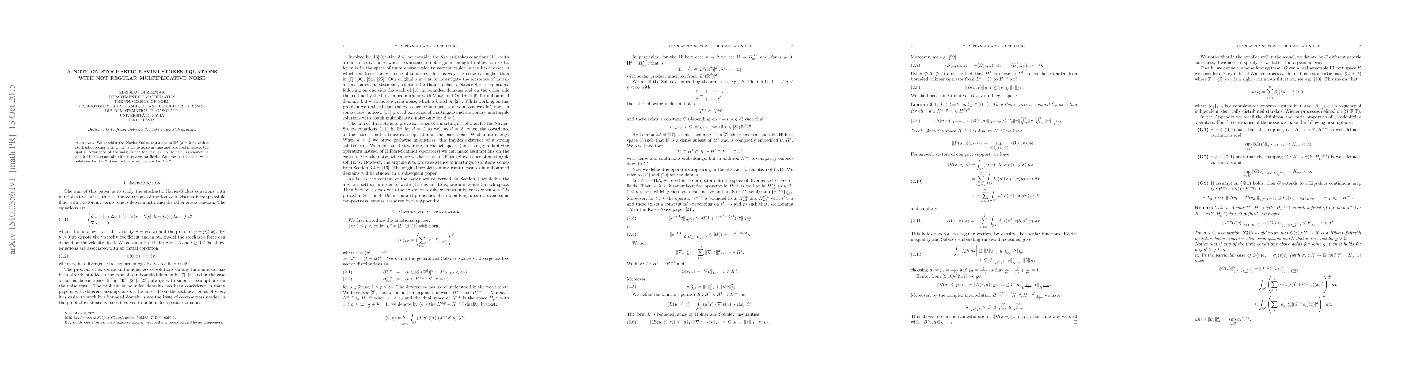 We consider the Navier-Stokes equations in $\mathbb R^d$ ($d=2,3$) with a stochastic forcing term which is white noise in time and coloured in space; the spatial covariance of the noise is not too regular, so It\^o calculus cannot be applied in the space of finite energy vector fields. We prove existence of weak solutions for $d=2,3$ and pathwise uniqueness for $d=2$.