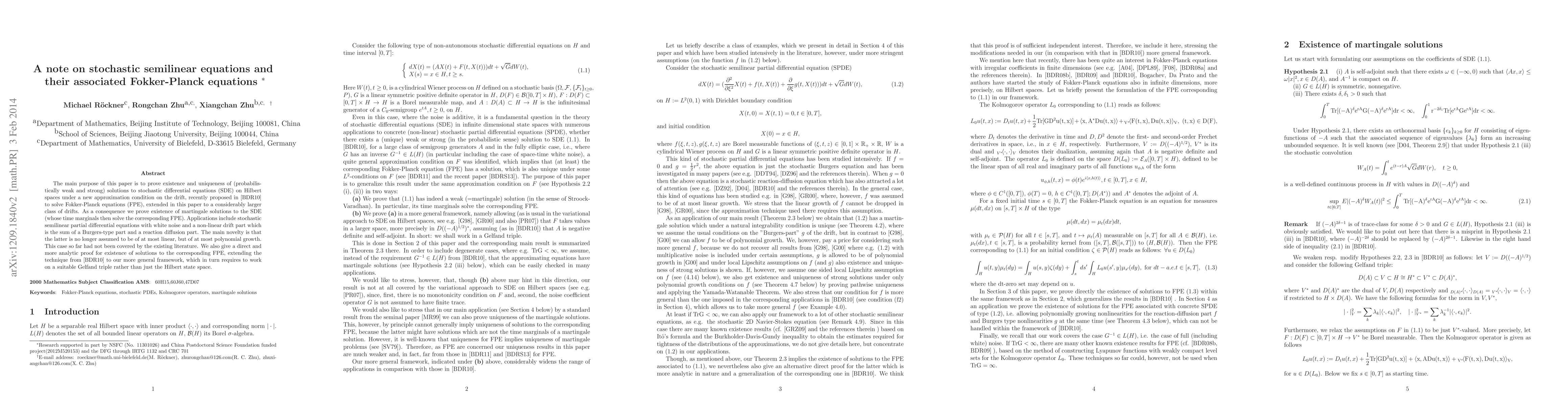 This paper explores semilinear stochastic partial differential equations using two methods: extending the [BDR10] framework to a Gelfand triple to prove the existence of solutions for associated Fokker-Planck equations, and applying an approximation technique to establish existence of unique strong solutions for the stochastic equations.