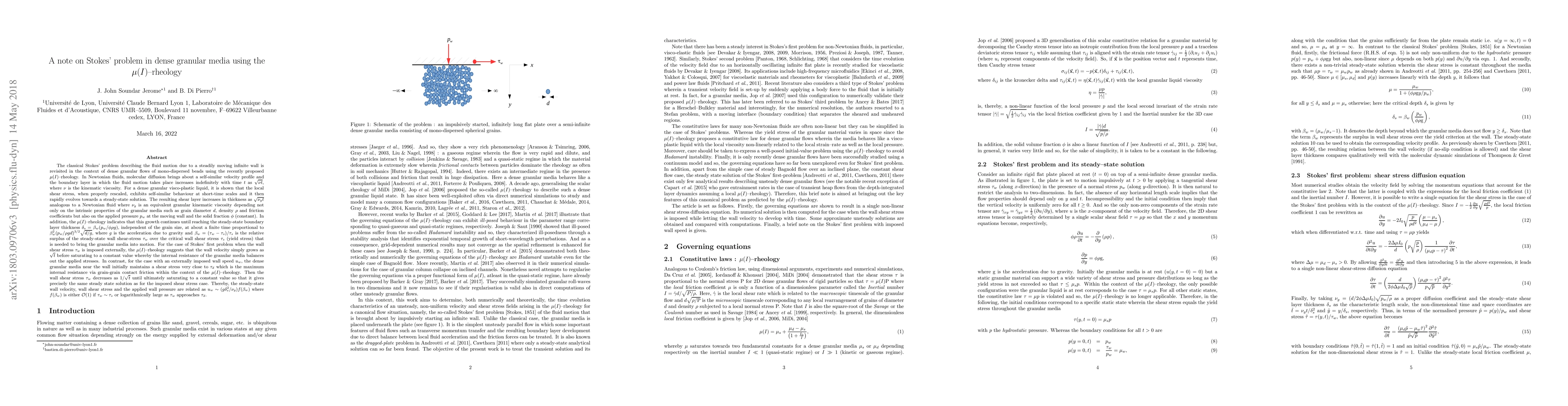This paper revisits Stokes' problem for dense granular media using $\mu(I)$-rheology, showing that a self-similar velocity profile emerges at short times before reaching a steady-state. The shear layer thickness grows as $\sqrt{\nu_g t}$ analogously to Newtonian fluids, where $\nu_g$ depends on granular properties and applied pressure.