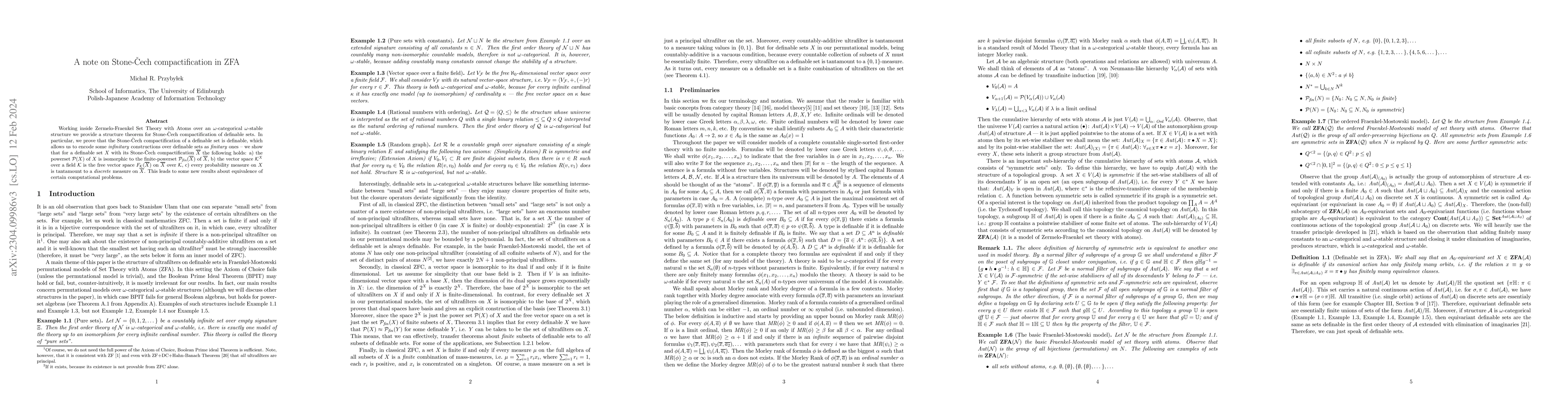 Working in Zermelo-Fraenkel Set Theory with Atoms over an $\omega$-categorical $\omega$-stable structure, we show how \emph{infinite} constructions over definable sets can be encoded as \emph{finite} constructions over the Stone-\v{C}ech compactification of the sets. In particular, we show that for a definable set $X$ with its Stone-\v{C}ech compactification $\overline{X}$ the following holds: a) the powerset $\mathcal{P}(X)$ of $X$ is isomorphic to the finite-powerset $\mathcal{P}_{\textit{fin}}(\overline{X})$ of $\overline{X}$, b) the vector space $\mathcal{K}^X$ over a field $\mathcal{K}$ is the free vector space $F_{\mathcal{K}}(\overline{X})$ on $\overline{X}$ over $\mathcal{K}$, c) every measure on $X$ is tantamount to a \emph{discrete} measure on $\overline{X}$. Moreover, we prove that the Stone-\v{C}ech compactification of a definable set is still definable, which allows us to obtain some results about equivalence of certain formalizations of register machines.