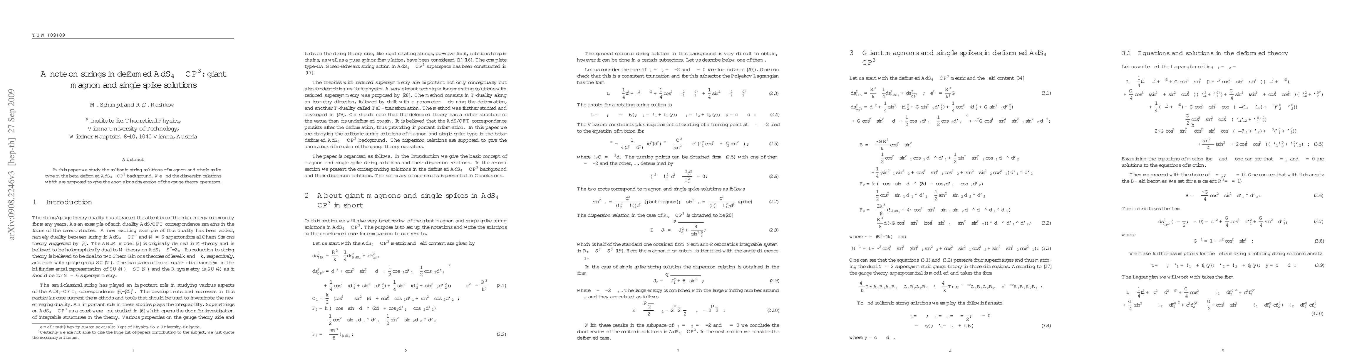 Summary: This paper investigates solitonic string solutions—magnon and single spike types—in the beta-deformed AdS_4 x CP3 background, deriving their dispersion relations to determine the anomalous dimension of corresponding gauge theory operators.