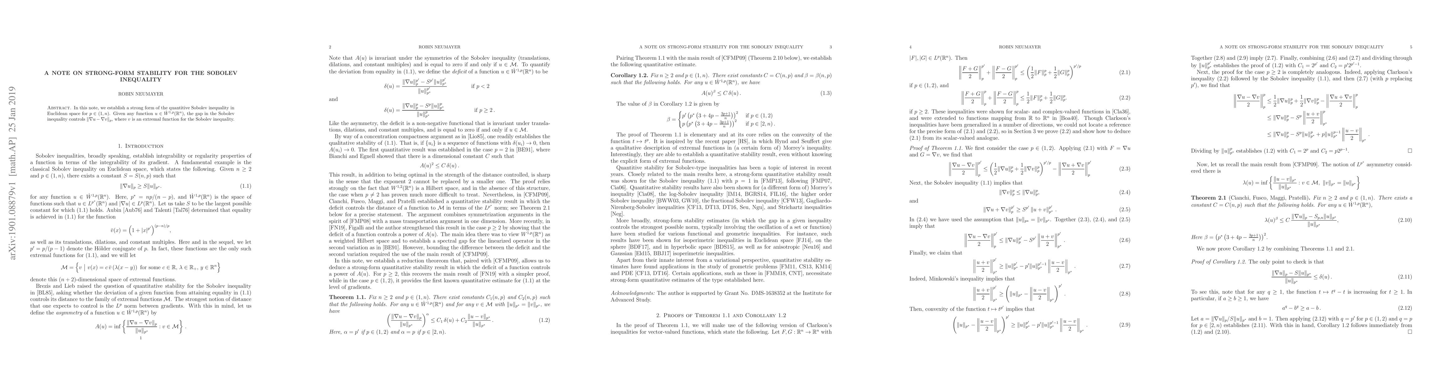 In this note, we establish a strong form of the quantitive Sobolev inequality in Euclidean space for $p \in (1,n)$. Given any function $u \in \dot W^{1,p}(\mathbb{R}^n)$, the gap in the Sobolev inequality controls $\| \nabla u -\nabla v\|_{p}$, where $v$ is an extremal function for the Sobolev inequality.