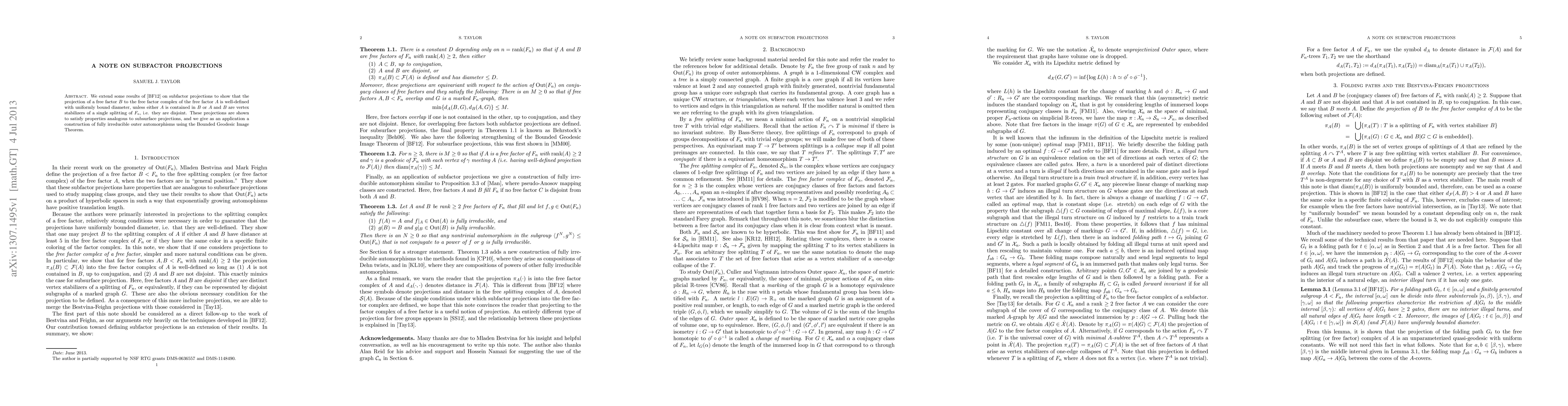 Researchers extend subfactor projection results to show that projections of free factors have uniformly bound diameter unless they share a common splitting, with applications in constructing fully irreducible outer automorphisms.