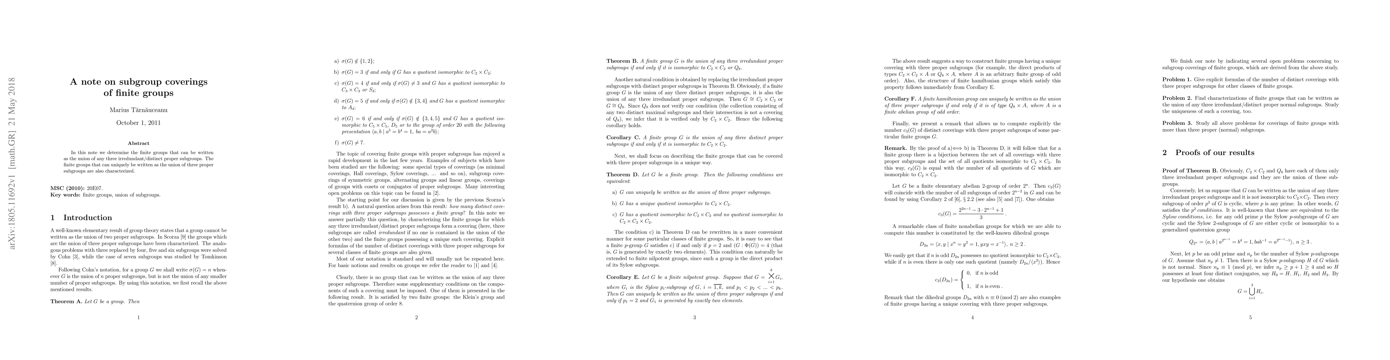 In this note we determine the finite groups that can be written as the union of any three irredundant/distinct proper subgroups. The finite groups that can uniquely be written as the union of three proper subgroups are also characterized.