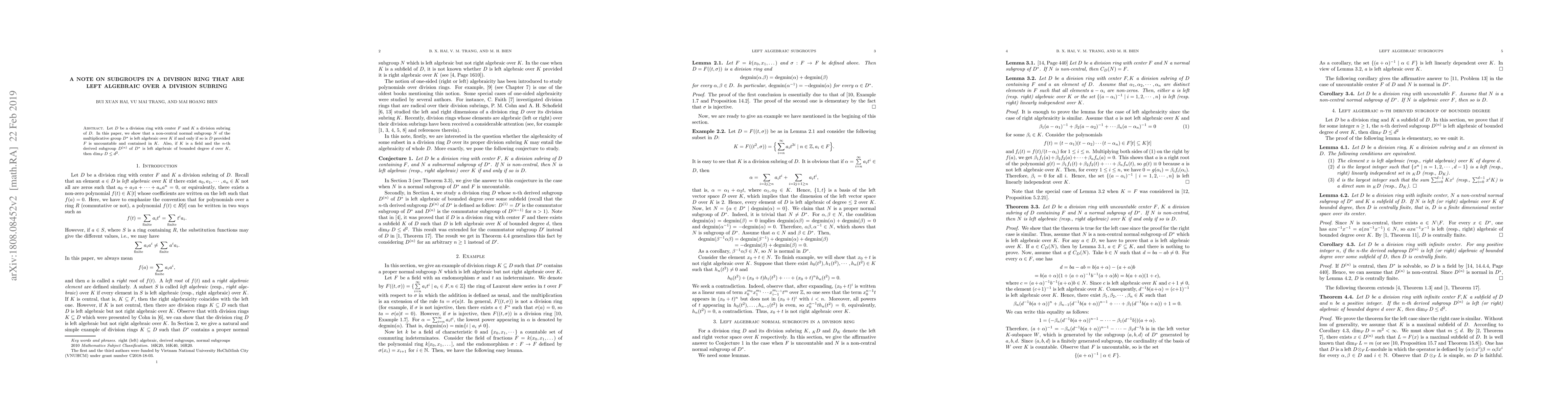This paper investigates the conditions under which a non-central normal subgroup $N$ of the multiplicative group $D^*$ in a division ring $D$ is left algebraic over a division subring $K$. It concludes that $N$ is left algebraic over $K$ if and only if $D$ is, provided $D$'s center $F$ is uncountable and contained in $K$. Additionally, if $K$ is a field and $D^{(n)}$ has bounded degree $d$ over $K$, then the dimension of $D$ over $F$ is at most $d^2$.