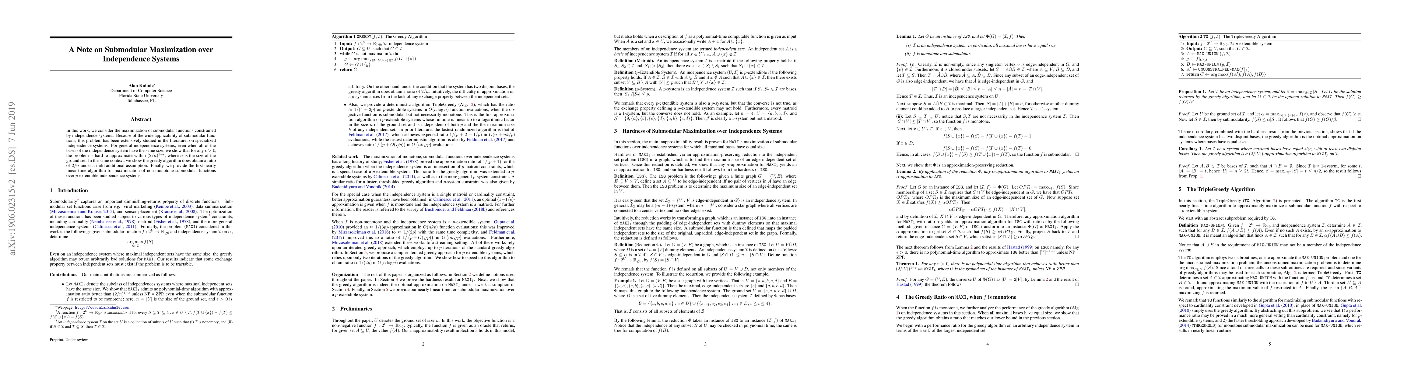 This paper studies the maximization of submodular functions within independence systems, proving approximation hardness and presenting a $2/n$ ratio via the greedy algorithm under mild conditions. It also introduces a nearly linear-time algorithm for non-monotone submodular function maximization over $p$-extendible independence systems.