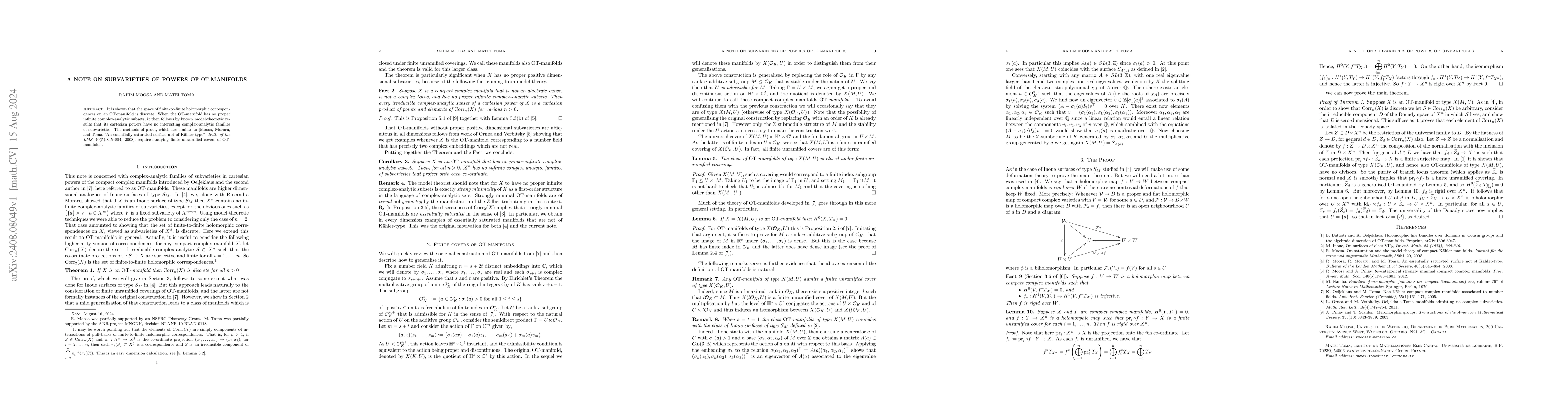 This paper demonstrates that the space of finite-to-finite holomorphic correspondences on an OT-manifold is discrete. It concludes that when the OT-manifold lacks proper infinite complex-analytic subsets, its cartesian powers have no notable families of complex-analytic subvarieties, employing methods akin to those used in a prior study by Moosa, Moraru, and Toma.
