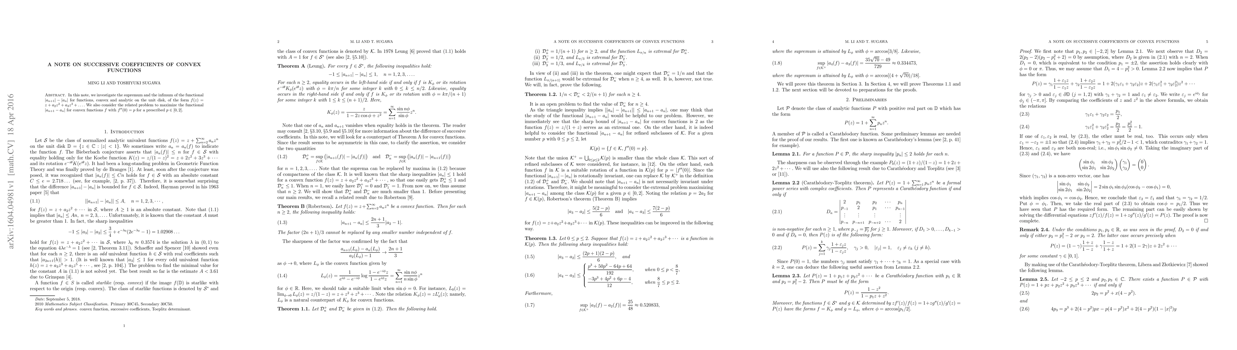 In this note, we investigate the supremum and the infimum of the functional $|a_{n+1}|-|a_{n}|$ for functions, convex and analytic on the unit disk, of the form $f(z)=z+a_2z^2+a_3z^3+\dots.$ We also consider the related problem to maximize the functional $|a_{n+1}-a_{n}|$ for convex functions $f$ with $f"(0)=p$ for a prescribed $p\in[0,2].$