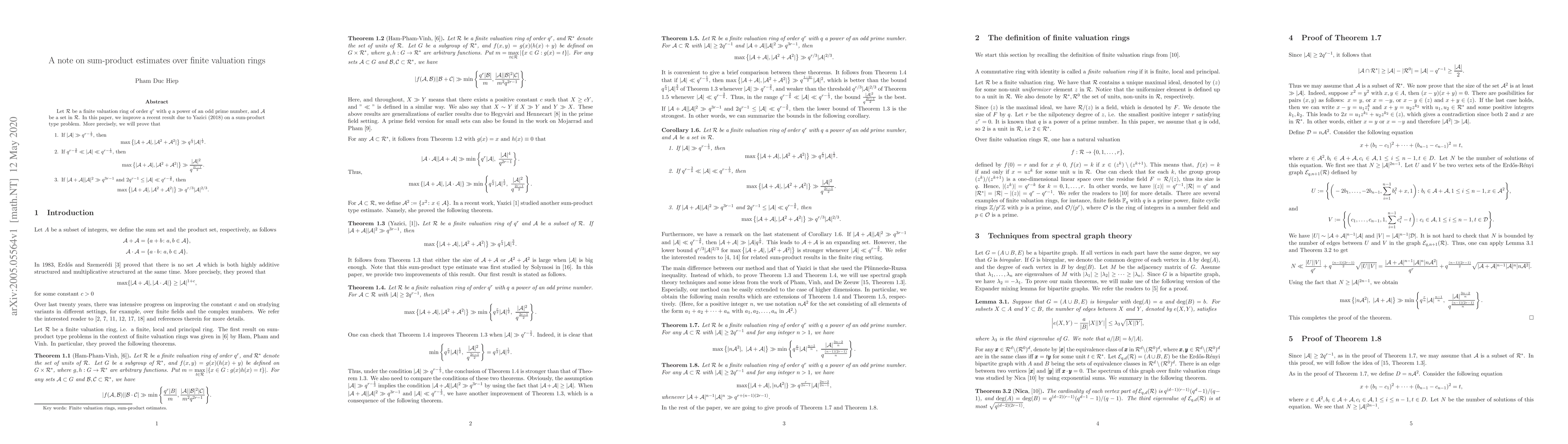 Let $\mathcal R$ be a finite valuation ring of order $q^r$ with $q$ a power of an odd prime number, and $\mathcal A$ be a set in $\mathcal R$. In this paper, we improve a recent result due to Yazici (2018) on a sum-product type problem. More precisely, we will prove that 1. If $|\mathcal A|\gg q^{r-\frac{1}{3}}$, then $$\max\left\lbrace |\mathcal A+\mathcal A|, |\mathcal A^2+\mathcal A^2|\right\rbrace \gg q^{\frac{r}{2}}|\mathcal A|^{\frac{1}{2}}.$$ 2. If $q^{r-\frac{3}{8}}\ll |\mathcal A|\ll q^{r-\frac{1}{3}}$, then $$\max\left\lbrace |\mathcal A+\mathcal A|, |\mathcal A^2+\mathcal A^2|\right\rbrace \gg \frac{|\mathcal A|^2}{q^{\frac{2r-1}{2}}}.$$ 3. If $|\mathcal A+\mathcal A||\mathcal A|^2\gg q^{3r-1}$ and $2q^{r-1}\le |\mathcal A|\ll q^{r-\frac{3}{8}}$, then $$\max\left\lbrace |\mathcal A+\mathcal A|, |\mathcal A^2+\mathcal A^2|\right\rbrace \gg q^{r/3}|\mathcal A|^{2/3}.$$