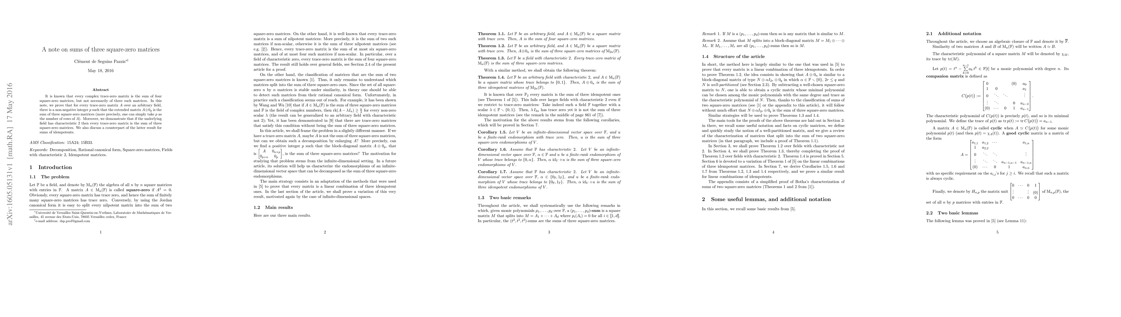 This paper proves that any trace-zero matrix over an arbitrary field can be expressed as the sum of three square-zero matrices when extended by a suitable number of rows, and it shows that this holds for any field, especially for fields of characteristic 2. It also explores a related result concerning sums of idempotents.