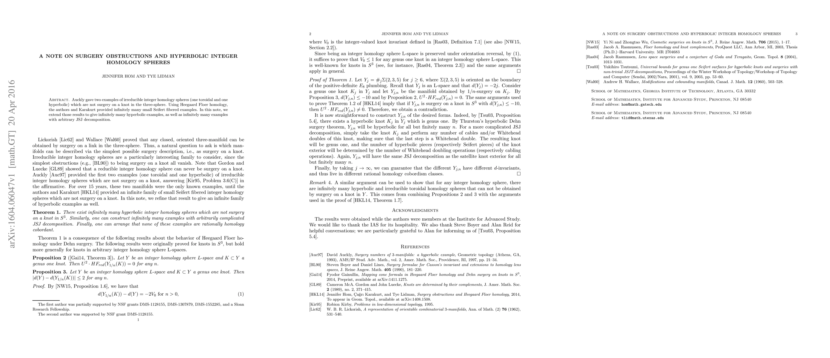 Auckly gave two examples of irreducible integer homology spheres (one toroidal and one hyperbolic) which are not surgery on a knot in the three-sphere. Using Heegaard Floer homology, the authors and Karakurt provided infinitely many small Seifert fibered examples. In this note, we extend those results to give infinitely many hyperbolic examples, as well as infinitely many examples with arbitrary JSJ decomposition.