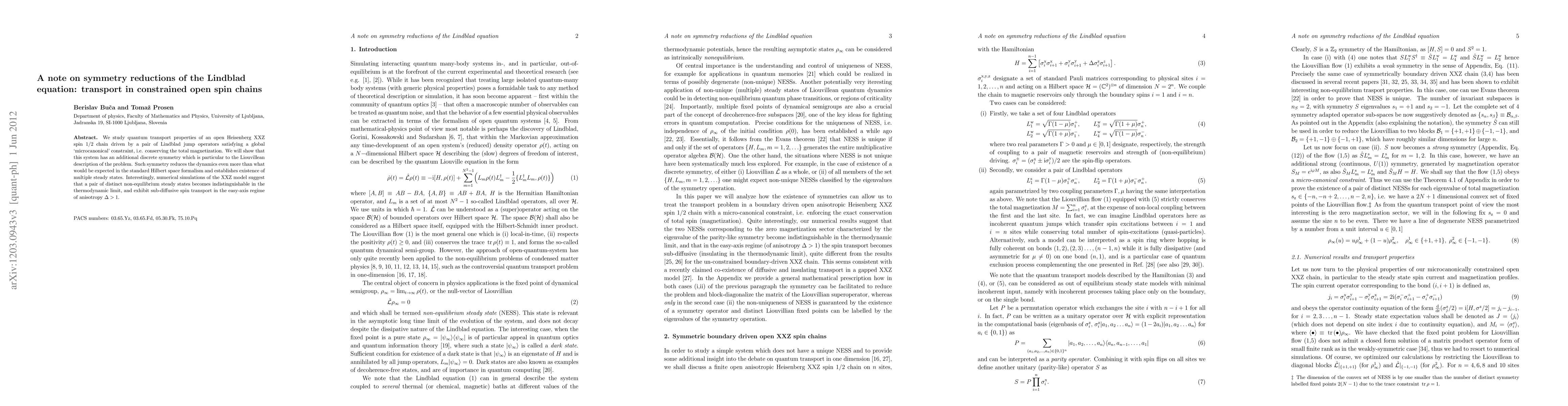 We study quantum transport properties of an open Heisenberg XXZ spin 1/2 chain driven by a pair of Lindblad jump operators satisfying a global `microcanonical' constraint, i.e. conserving the total magnetization. We will show that this system has an additional discrete symmetry which is particular to the Liouvillean description of the problem. Such symmetry reduces the dynamics even more than what would be expected in the standard Hilbert space formalism and establishes existence of multiple steady states. Interestingly, numerical simulations of the XXZ model suggest that a pair of distinct non-equilibrium steady states becomes indistinguishable in the thermodynamic limit, and exhibit sub-diffusive spin transport in the easy-axis regime of anisotropy Delta > 1.
