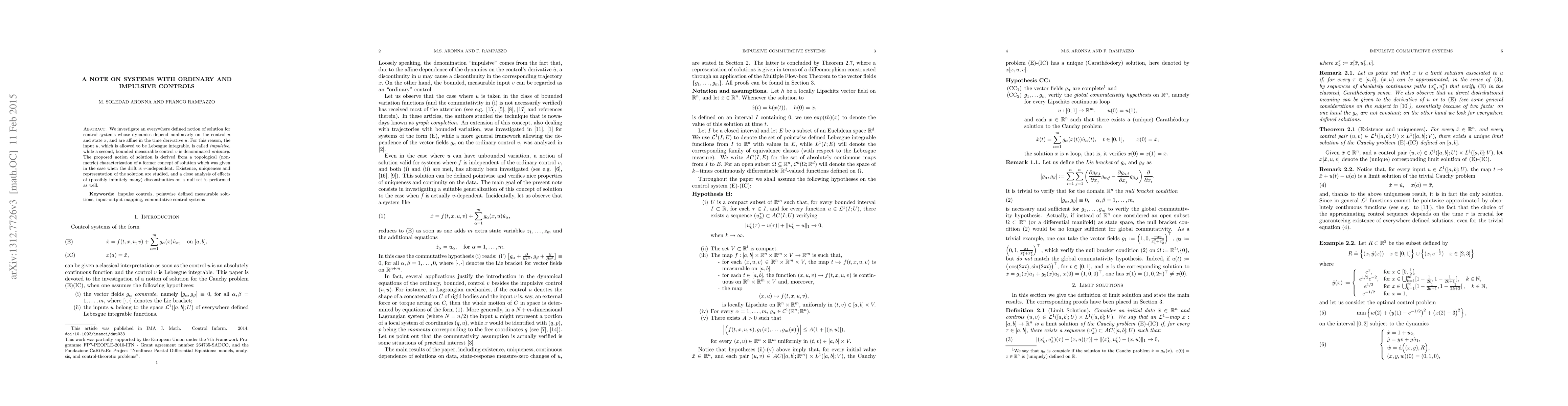 We investigate an everywhere defined notion of solution for control systems whose dynamics depend nonlinearly on the control $u$ and state $x,$ and are affine in the time derivative $\dot u.$ For this reason, the input $u,$ which is allowed to be Lebesgue integrable, is called impulsive, while a second, bounded measurable control $v$ is denominated ordinary. The proposed notion of solution is derived from a topological (non-metric) characterization of a former concept of solution which was given in the case when the drift is $v$-independent. Existence, uniqueness and representation of the solution are studied, and a close analysis of effects of (possibly infinitely many) discontinuities on a null set is performed as well.