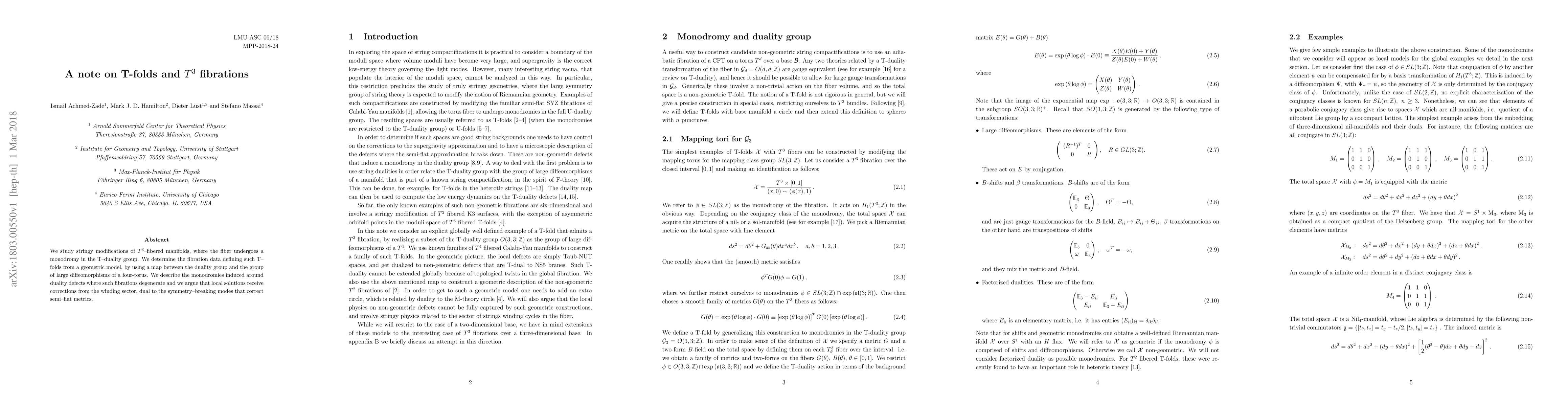We study stringy modifications of $T^3$-fibered manifolds, where the fiber undergoes a monodromy in the T-duality group. We determine the fibration data defining such T-folds from a geometric model, by using a map between the duality group and the group of large diffeomorphisms of a four-torus. We describe the monodromies induced around duality defects where such fibrations degenerate and we argue that local solutions receive corrections from the winding sector, dual to the symmetry-breaking modes that correct semi-flat metrics.