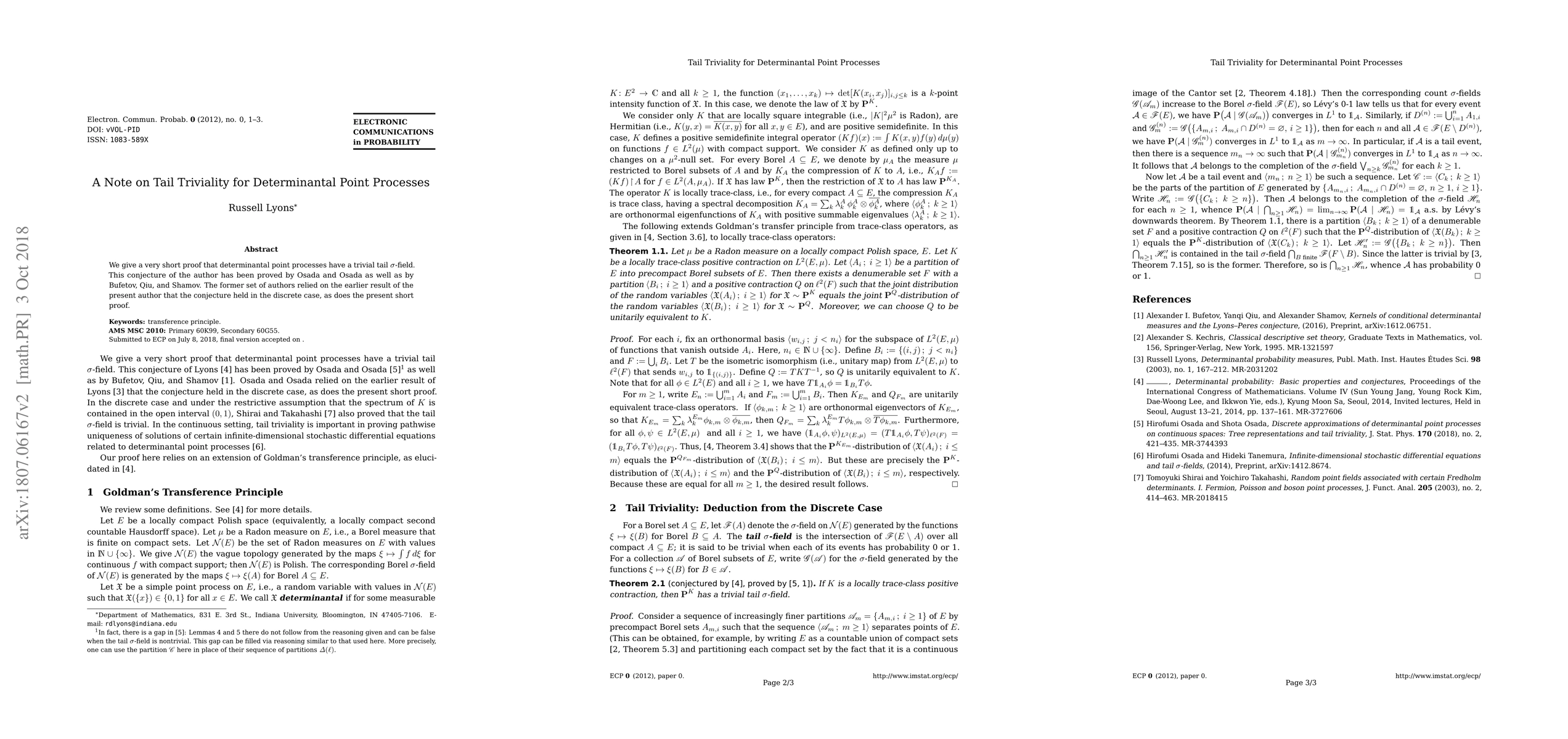 We give a very short proof that determinantal point processes have a trivial tail $\sigma$-field. This conjecture of the author has been proved by Osada and Osada as well as by Bufetov, Qiu, and Shamov. The former set of authors relied on the earlier result of the present author that the conjecture held in the discrete case, as does the present short proof.