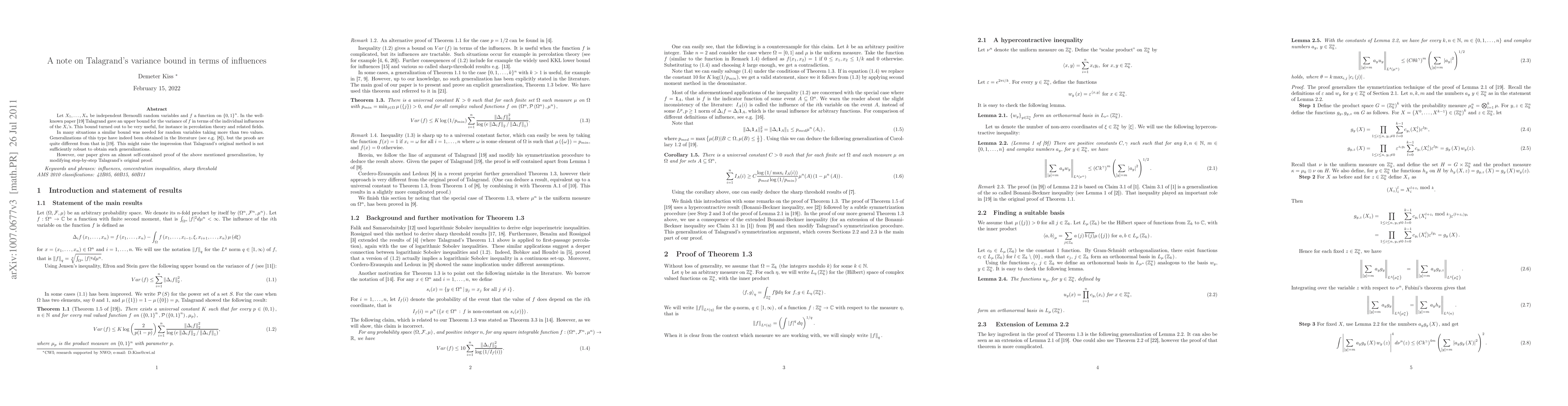 Let X_1,..., X_n be independent Bernoulli random variables and $f$ a function on {0,1}^n. In the well-known paper (Talagrand1994) Talagrand gave an upper bound for the variance of f in terms of the individual influences of the X_i's. This bound turned out to be very useful, for instance in percolation theory and related fields. In many situations a similar bound was needed for random variables taking more than two values. Generalizations of this type have indeed been obtained in the literature (see e.g. (Cordero-Erausquin2011), but the proofs are quite different from that in (Talagrand1994). This might raise the impression that Talagrand's original method is not sufficiently robust to obtain such generalizations. However, our paper gives an almost self-contained proof of the above mentioned generalization, by modifying step-by-step Talagrand's original proof.