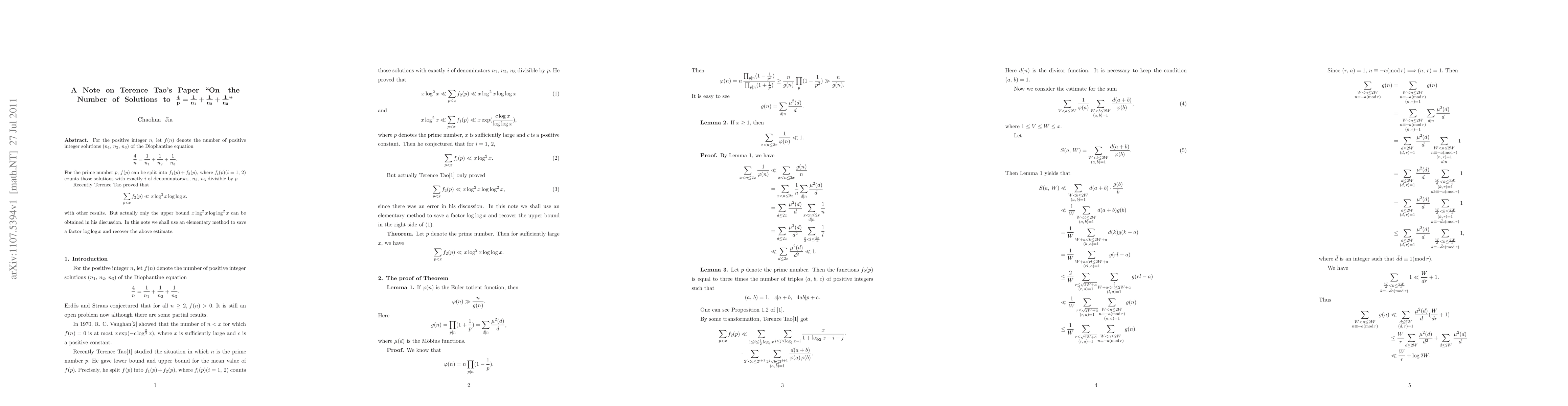 This paper discusses Terence Tao's result on the number of solutions to the Diophantine equation \( \frac{4}{n} = \frac{1}{n_1} + \frac{1}{n_2} + \frac{1}{n_3} \) and shows how an elementary method can improve the upper bound on the sum of solutions where two denominators are divisible by a prime \( p \), reducing it from \( x \log^2 x \log \log^2 x \) to \( x \log^2 x \log \log x \).