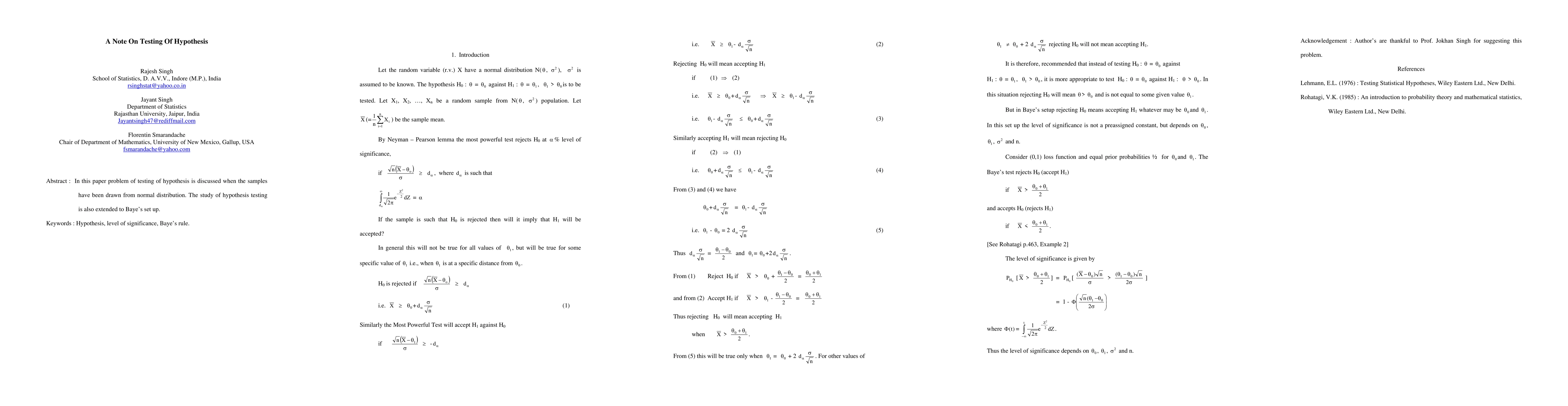 In this paper, a problem of testing is discussed when the samples have been drawn from the normal distribution. The study of hypothesis testing is also extended to Baye's set up.