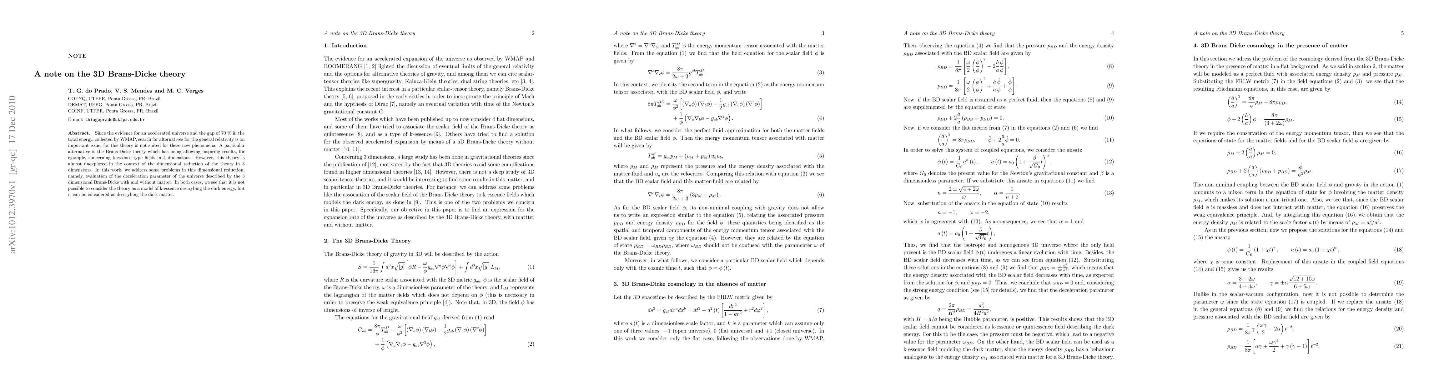 Since the evidence for an accelerated universe and the gap of 70% in the total energy, collected by WMAP, search for alternatives for the general relativity is an important issue, for this theory is not suited for these new phenomena. A particular alternative is the Brans-Dicke theory which has being allowing inspiring results, for example, concerning k-essence type fields in 4 dimensions. However, this theory is almost unexplored in the context of the dimensional reduction of the theory in 3 dimensions. In this work, we address some problems in this dimensional reduction, namely, evaluation of the deceleration parameter of the universe described by the 3 dimensional Brans-Dicke with and without matter. In both cases, we see that it is not possible to consider the theory as a model of k-essence descrybing the dark energy, but it can be considered as descrybing the dark matter.