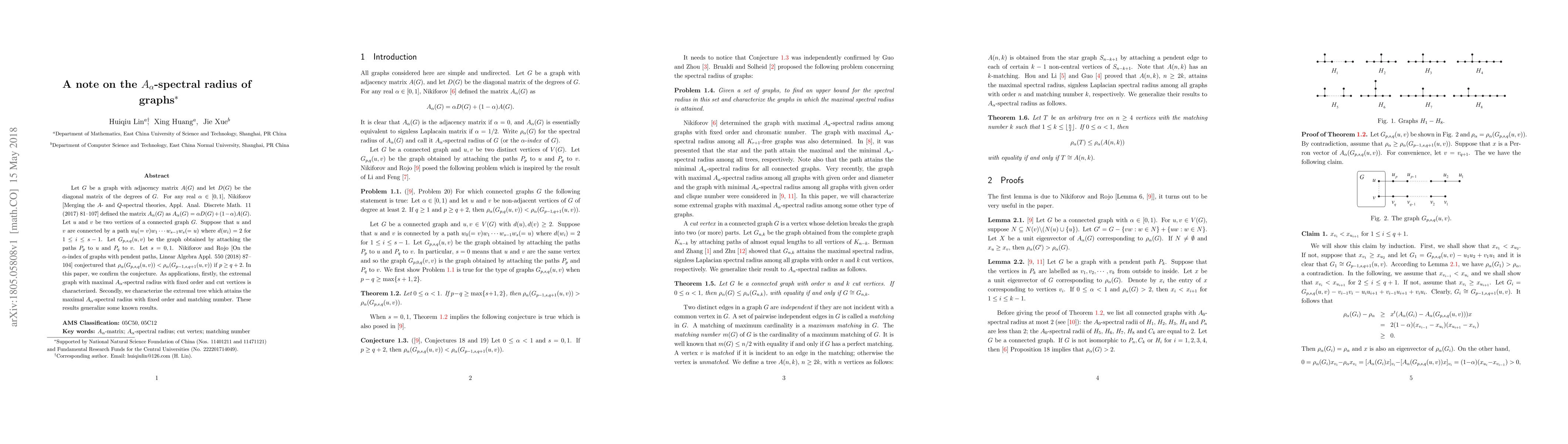 Let $G$ be a graph with adjacency matrix $A(G)$ and let $D(G)$ be the diagonal matrix of the degrees of $G$. For any real $\alpha\in [0,1]$, Nikiforov [Merging the $A$- and $Q$-spectral theories, Appl. Anal. Discrete Math. 11 (2017) 81--107] defined the matrix $A_{\alpha}(G)$ as $A_{\alpha}(G)=\alpha D(G)+(1-\alpha)A(G).$ Let $u$ and $v$ be two vertices of a connected graph $G$. Suppose that $u$ and $v$ are connected by a path $w_0(=v)w_1\cdots w_{s-1}w_s(=u)$ where $d(w_i)=2$ for $1\leq i\leq s-1$. Let $G_{p,s,q}(u,v)$ be the graph obtained by attaching the paths $P_p$ to $u$ and $P_q$ to $v$. Let $s=0,1$. Nikiforov and Rojo [On the $\alpha$-index of graphs with pendent paths, Linear Algebra Appl. 550 (2018) 87--104] conjectured that $\rho_{\alpha}(G_{p,s,q}(u,v))<\rho_{\alpha}(G_{p-1,s,q+1}(u,v))$ if $p\geq q+2.$ In this paper, we confirm the conjecture. As applications, firstly, the extremal graph with maximal $A_{\alpha}$-spectral radius with fixed order and cut vertices is characterized. Secondly, we characterize the extremal tree which attains the maximal $A_{\alpha}$-spectral radius with fixed order and matching number. These results generalize some known results.