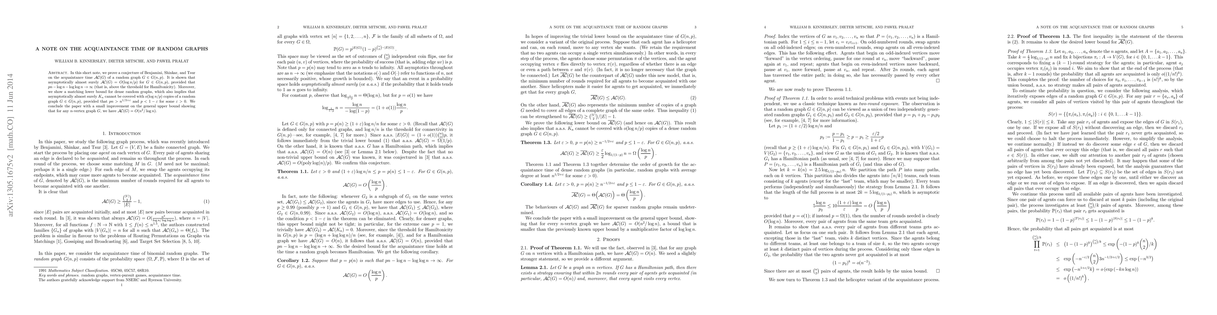 In this short note, we prove the conjecture of Benjamini, Shinkar, and Tsur on the acquaintance time $AC(G)$ of a random graph $G \in G(n,p)$. It is shown that asymptotically almost surely $AC(G) = O(\log n / p)$ for $G \in G(n,p)$, provided that $pn > (1+\epsilon) \log n$ for some $\epsilon > 0$ (slightly above the threshold for connectivity). Moreover, we show a matching lower bound for dense random graphs, which also implies that asymptotically almost surely $K_n$ cannot be covered with $o(\log n / p)$ copies of a random graph $G \in G(n,p)$, provided that $pn > n^{1/2+\epsilon}$ and $p < 1-\epsilon$ for some $\epsilon>0$. We conclude the paper with a small improvement on the general upper bound showing that for any $n$-vertex graph $G$, we have $AC(G) = O(n^2/\log n)$.