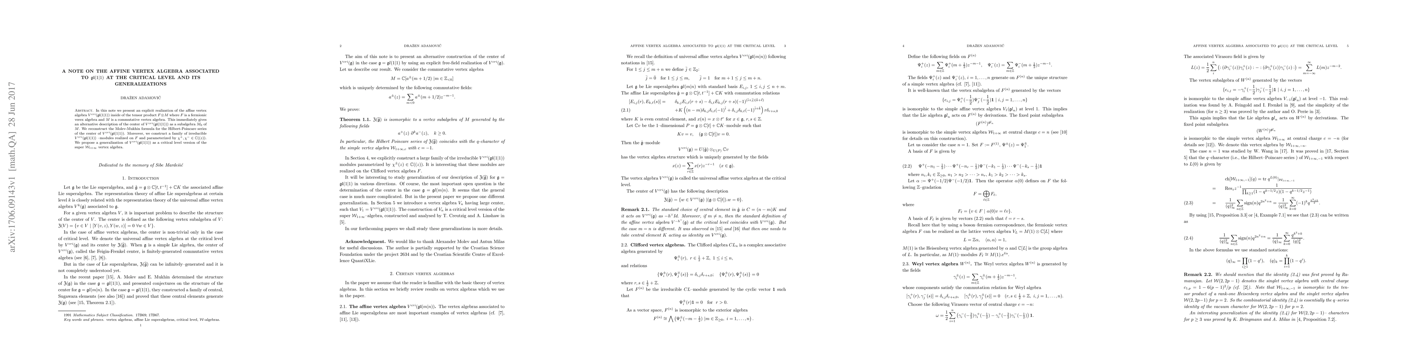 In this note we present an explicit realization of the affine vertex algebra $V^{cri}(\frak{gl}(1 \vert 1)) $ inside of the tensor product $F\otimes M$ where $F$ is a fermionic verex algebra and $M$ is a commutative vertex algebra. This immediately gives an alternative description of the center of $V^{cri}(\frak{gl}(1 \vert 1) ) )$ as a subalgebra $M _ 0$ of $M$. We reconstruct the Molev-Mukhin formula for the Hilbert-Poincare series of the center of $V^ {cri}(\frak{gl}(1 \vert 1) )$. Moreover, we construct a family of irreducible $V^{cri}(\frak{gl}(1 \vert 1))$ -modules realized on $F$ and parameterized by $\chi^+, \chi ^- \in {\Bbb C}((z)). $ We propose a generalization of $V^ {cri}(\frak{gl}(1 \vert 1))$ as a critical level version of the super $\mathcal W_{1+\infty}$ vertex algebra.