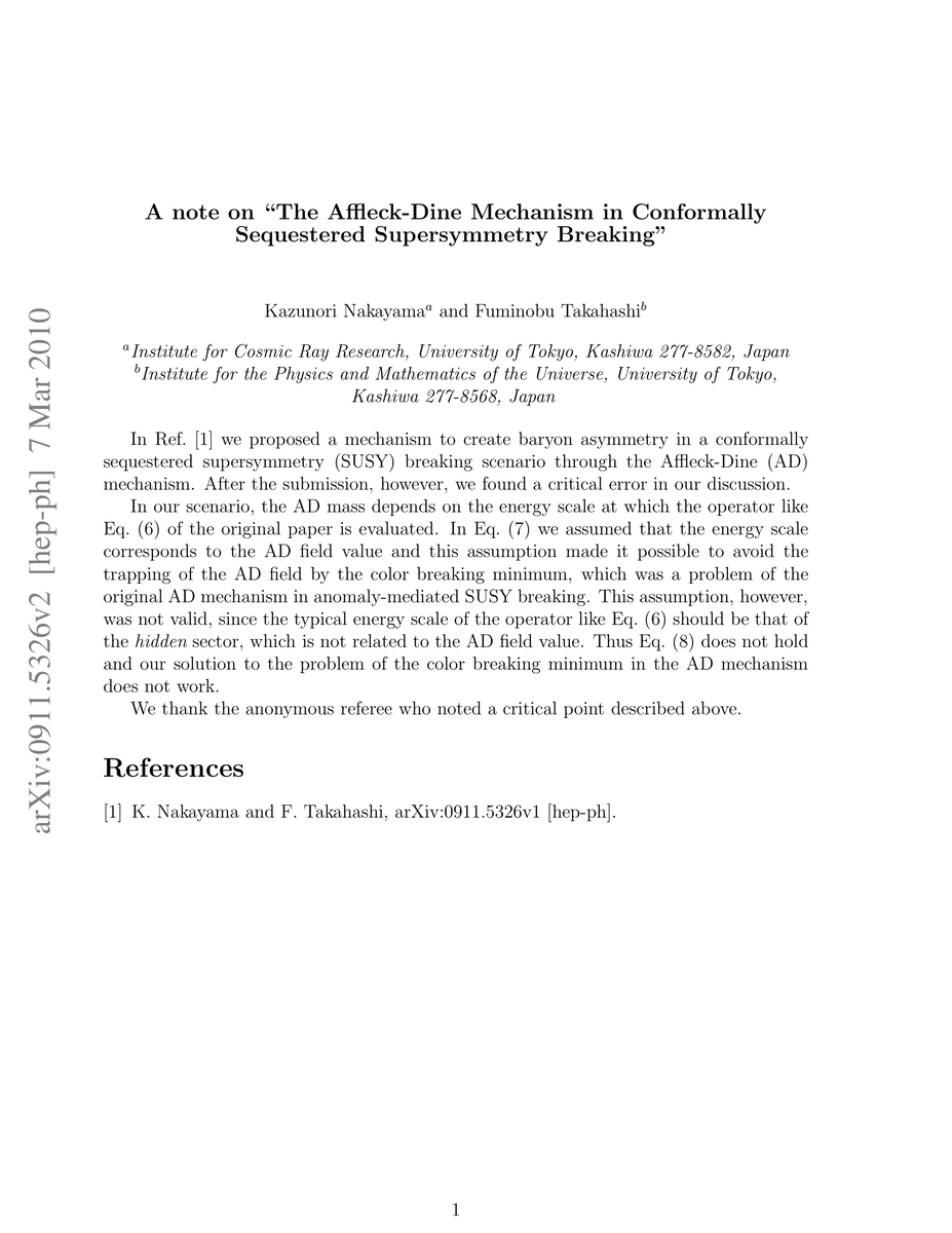 Summary: This paper corrects a critical error identified in a previous version proposing the Affleck-Dine mechanism for generating baryon asymmetry in a conformally sequestered supersymmetry breaking scenario. The authors provide a note to clarify and rectify the mistake.