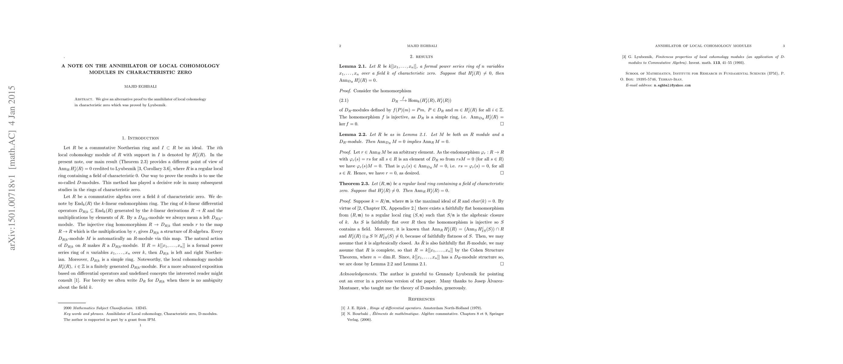 Summary: This paper provides an alternate proof for the annihilator of local cohomology modules in characteristic zero, building on Lyubeznik's original work. The new approach aims to offer a clearer understanding of the topic.