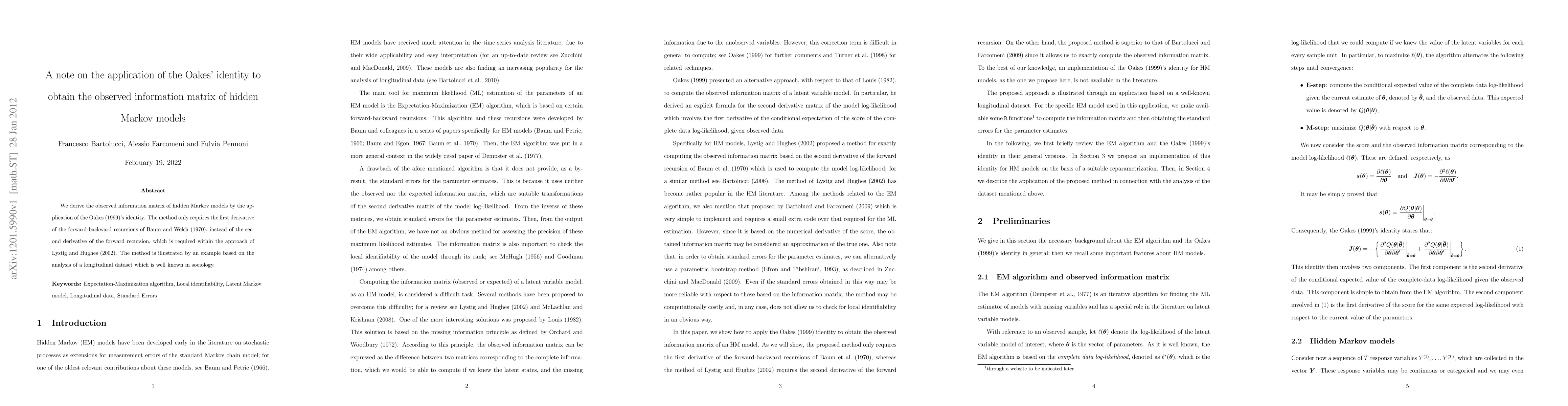 This paper derives the observed information matrix for hidden Markov models using Oakes' identity, simplifying the process by requiring only the first derivative of forward-backward recursions instead of the second derivative used in previous methods. An example from sociology is provided to illustrate the application.