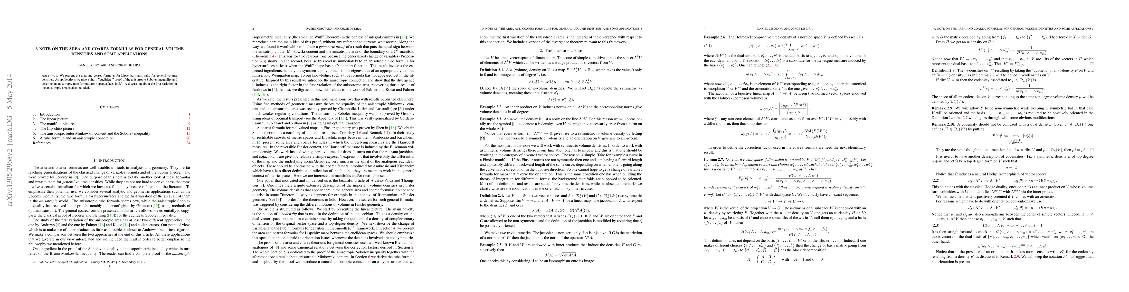 The paper presents area and coarea formulas for Lipschitz maps with general volume densities, enabling applications such as an anisotropic Sobolev inequality and a tube formula for hypersurfaces in R^n.
