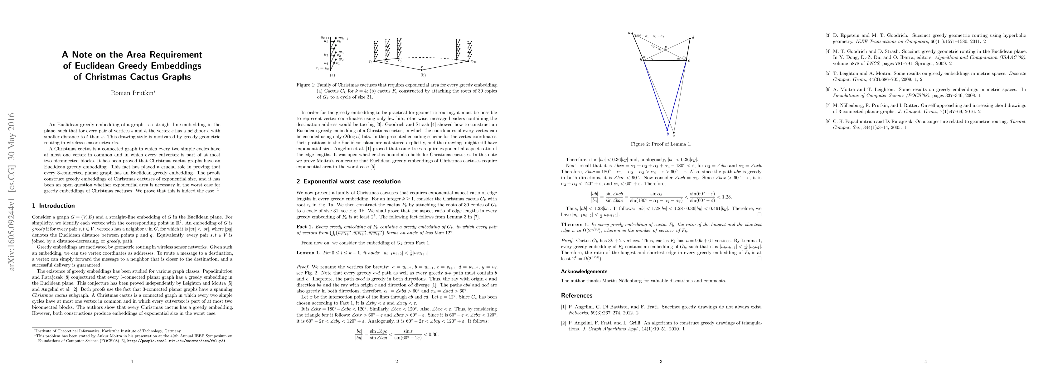 An Euclidean greedy embedding of a graph is a straight-line embedding in the plane, such that for every pair of vertices $s$ and $t$, the vertex $s$ has a neighbor $v$ with smaller distance to $t$ than $s$. This drawing style is motivated by greedy geometric routing in wireless sensor networks. A Christmas cactus is a connected graph in which every two simple cycles have at most one vertex in common and in which every cutvertex is part of at most two biconnected blocks. It has been proved that Christmas cactus graphs have an Euclidean greedy embedding. This fact has played a crucial role in proving that every 3-connected planar graph has an Euclidean greedy embedding. The proofs construct greedy embeddings of Christmas cactuses of exponential size, and it has been an open question whether exponential area is necessary in the worst case for greedy embeddings of Christmas cactuses. We prove that this is indeed the case.