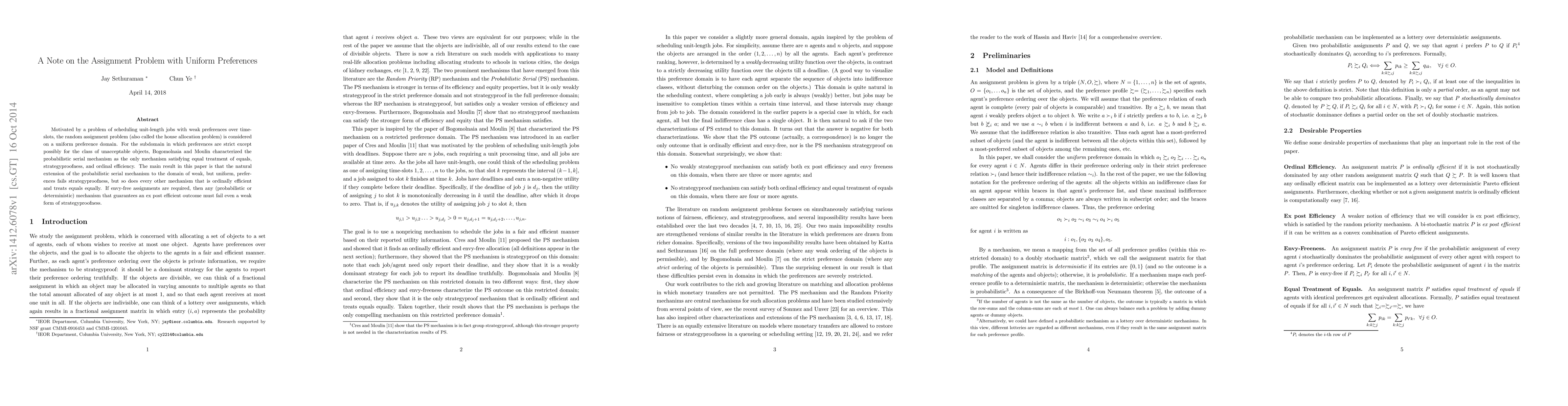 Motivated by a problem of scheduling unit-length jobs with weak preferences over time-slots, the random assignment problem (also called the house allocation problem) is considered on a uniform preference domain. For the subdomain in which preferences are strict except possibly for the class of unacceptable objects, Bogomolnaia and Moulin characterized the probabilistic serial mechanism as the only mechanism satisfying equal treatment of equals, strategyproofness, and ordinal efficiency. The main result in this paper is that the natural extension of the probabilistic serial mechanism to the domain of weak, but uniform, preferences fails strategyproofness, but so does every other mechanism that is ordinally efficient and treats equals equally. If envy-free assignments are required, then any (probabilistic or deterministic) mechanism that guarantees an ex post efficient outcome must fail even a weak form of strategyproofness.