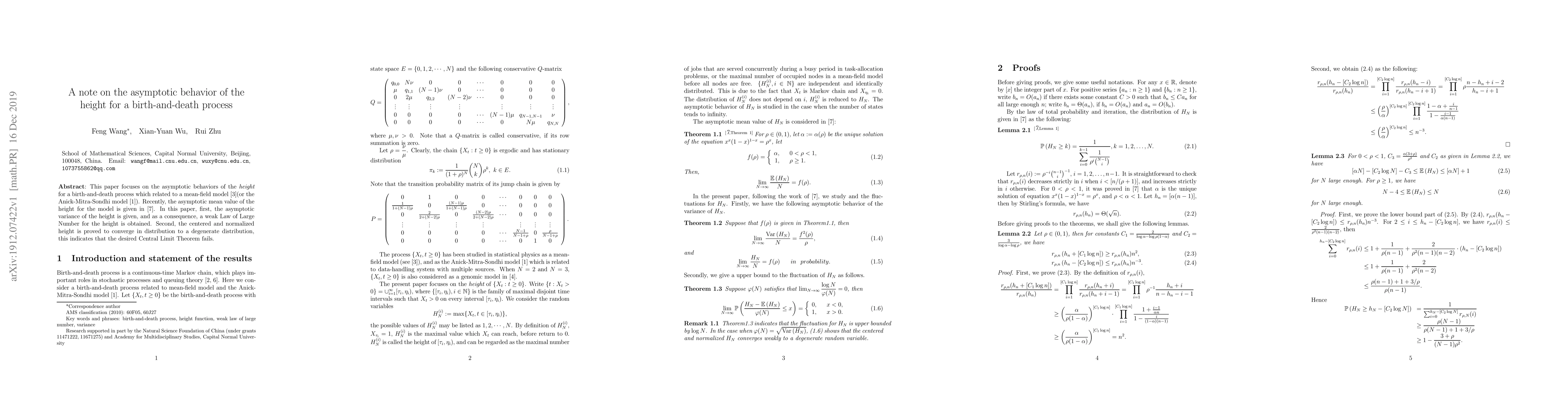 This paper focuses on the asymptotic behaviors of the {\it height} for a birth-and-death process which related to a mean-field model \cite{FFS}(or the Anick-Mitra-Sondhi model \cite{DDM}). Recently, the asymptotic mean value of the height for the model is given in \cite{LAV}. In this paper, first, the asymptotic variance of the height is given, and as a consequence, a weak Law of Large Number for the height is obtained. Second, the centered and normalized height is proved to converge in distribution to a degenerate distribution, this indicates that the desired Central Limit Theorem fails.