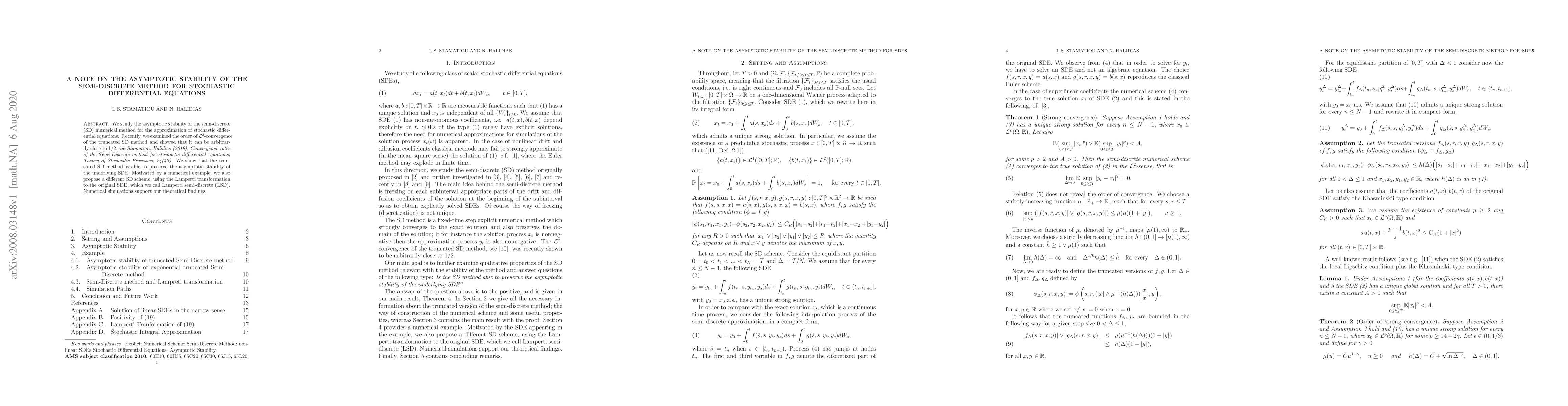 This paper investigates the asymptotic stability of the semi-discrete method for approximating stochastic differential equations (SDEs). It demonstrates that the truncated semi-discrete method preserves asymptotic stability and proposes a Lamperti semi-discrete scheme, supported by numerical simulations.