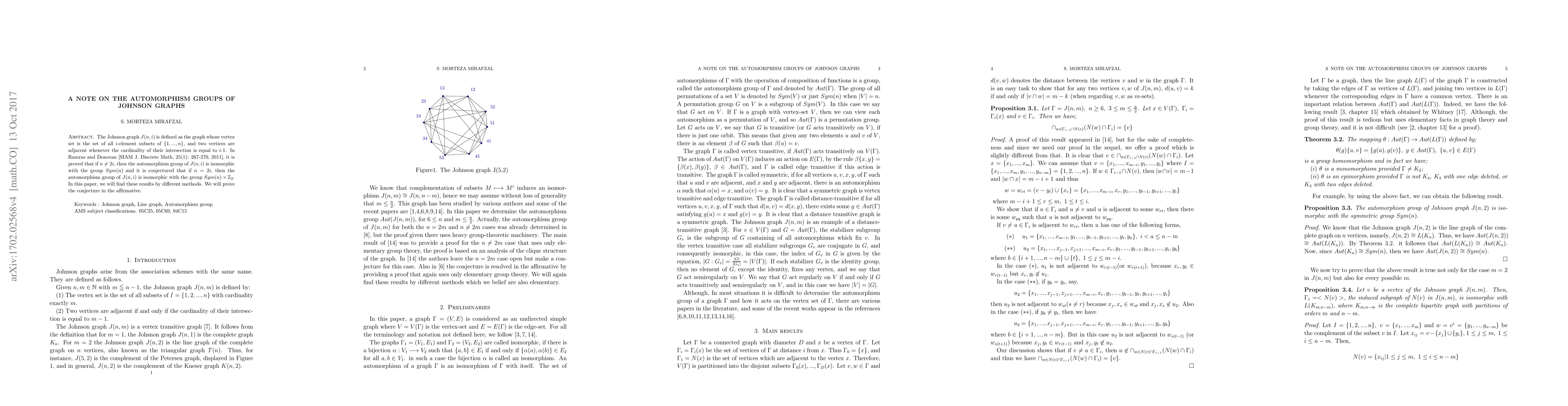 The Johnson graph $J(n, i)$ is defined as the graph whose vertex set is the set of all $i$-element subsets of $\{1, . . ., n \}$, and two vertices are adjacent whenever the cardinality of their intersection is equal to $i$-1. In Ramras and Donovan [SIAM J. Discrete Math, 25(1): 267-270, 2011], it is proved that if $ n \neq 2i$, then the automorphism group of $J(n, i)$ is isomorphic with the group $Sym(n)$ and it is conjectured that if $n = 2i$, then the automorphism group of $J(n, i)$ is isomorphic with the group $ Sym(n) \times \mathbb{Z}_2$. In this paper, we will find these results by different methods. We will prove the conjecture in the affirmative.