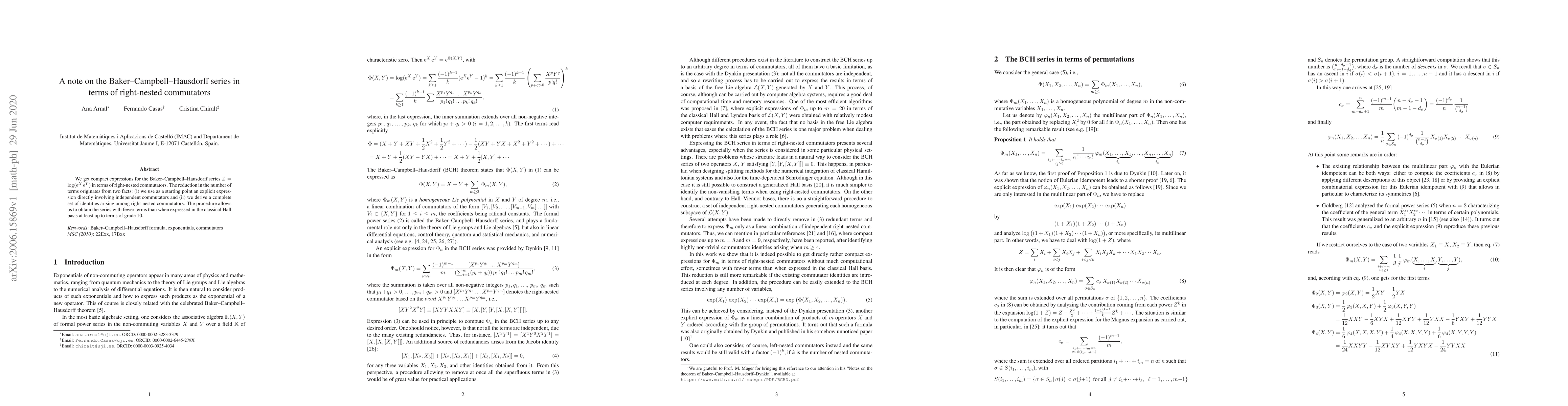 This paper presents compact expressions for the Baker-Campbell-Hausdorff series using right-nested commutators, reducing the number of terms by leveraging identities among these commutators and starting from an explicit expression involving independent commutators. The method achieves fewer terms than the classical Hall basis up to grade 10.