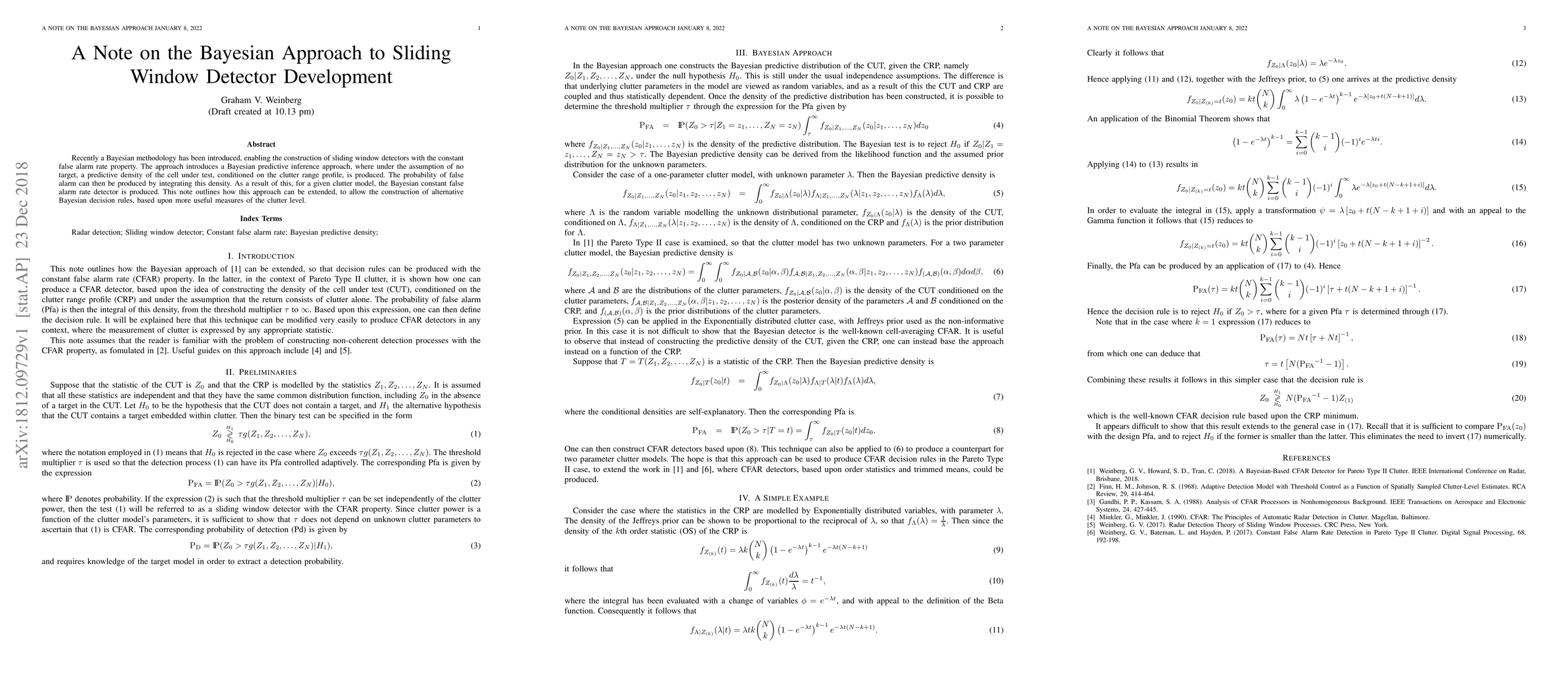 Recently a Bayesian methodology has been introduced, enabling the construction of sliding window detectors with the constant false alarm rate property. The approach introduces a Bayesian predictive inference approach, where under the assumption of no target, a predictive density of the cell under test, conditioned on the clutter range profile, is produced. The probability of false alarm can then be produced by integrating this density. As a result of this, for a given clutter model, the Bayesian constant false alarm rate detector is produced. This note outlines how this approach can be extended, to allow the construction of alternative Bayesian decision rules, based upon more useful measures of the clutter level.