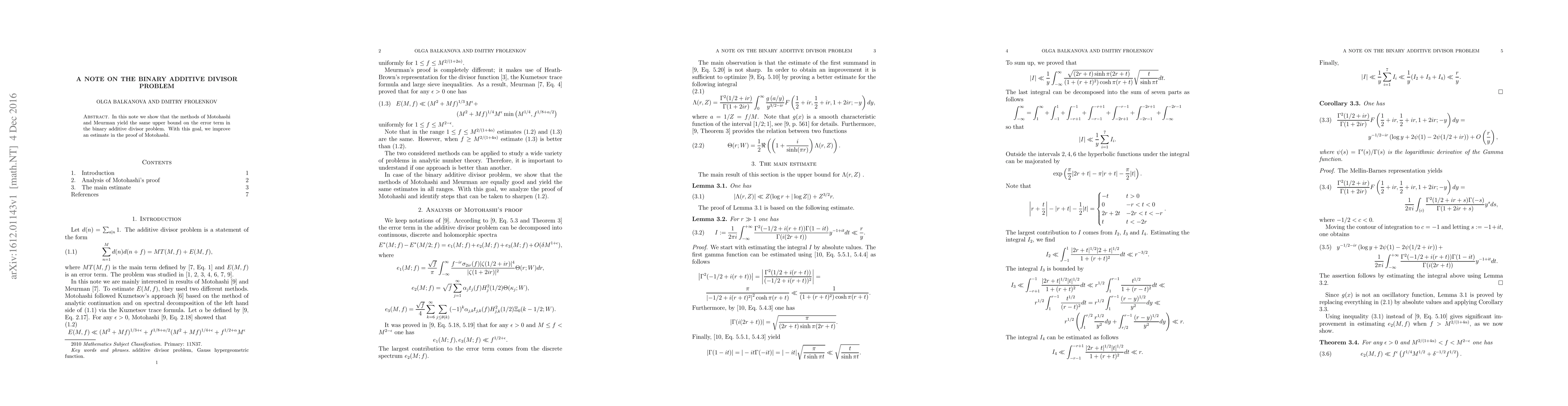 In this note we show that the methods of Motohashi and Meurman yield the same upper bound on the error term in the binary additive divisor problem. With this goal, we improve an estimate in the proof of Motohashi.