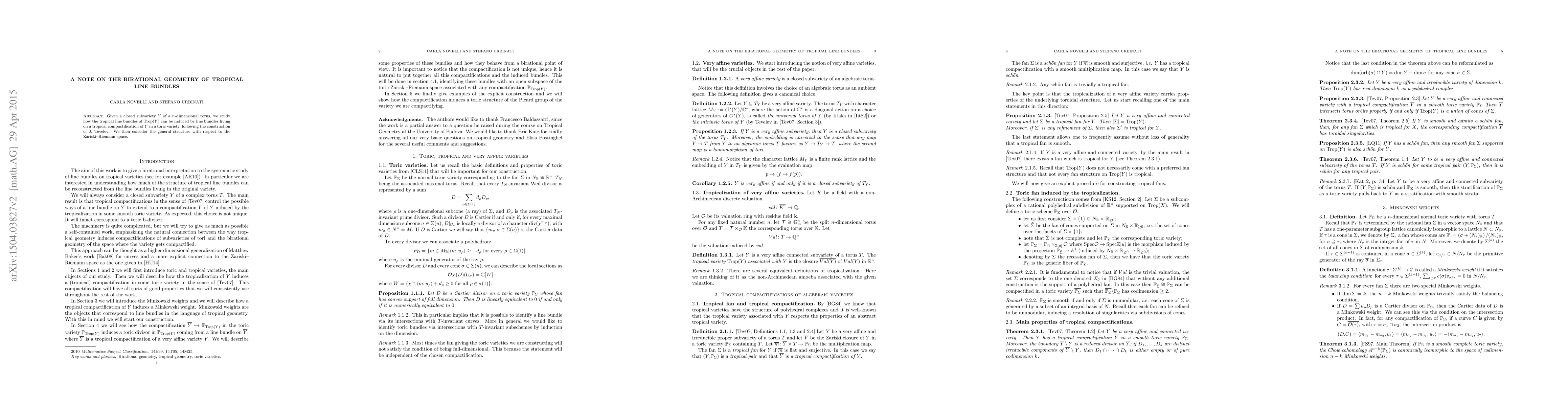 This paper explores how tropical line bundles on a closed subvariety Y within an n-dimensional torus relate to line bundles on a tropical compactification of Y in a toric variety, utilizing Jenia Tevelev's construction, and examines the general structure through the lens of the Zariski-Riemann space.