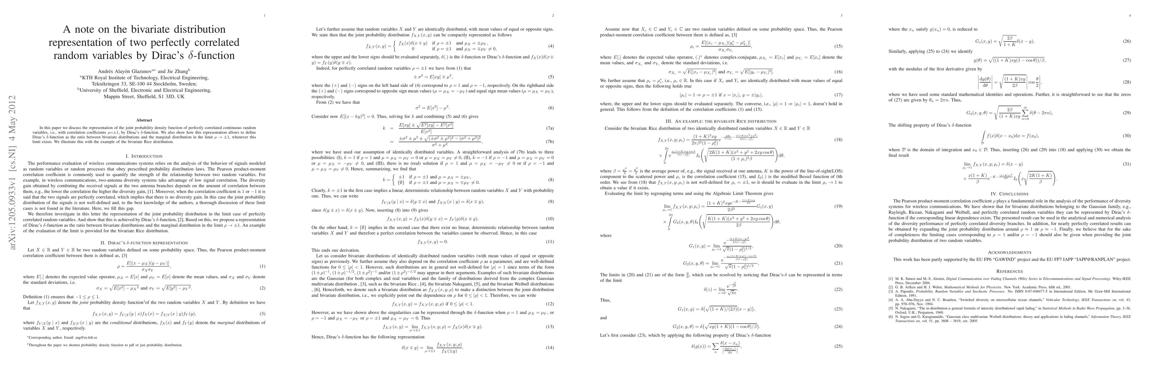 This paper explores the joint probability density function of perfectly correlated continuous random variables using Dirac's $\delta$-function, demonstrating its representation and defining the $\delta$-function as the ratio between bivariate and marginal distributions in the limit of correlation coefficients $\rho \rightarrow \pm1$. An example using the bivariate Rice distribution is provided to illustrate these concepts.