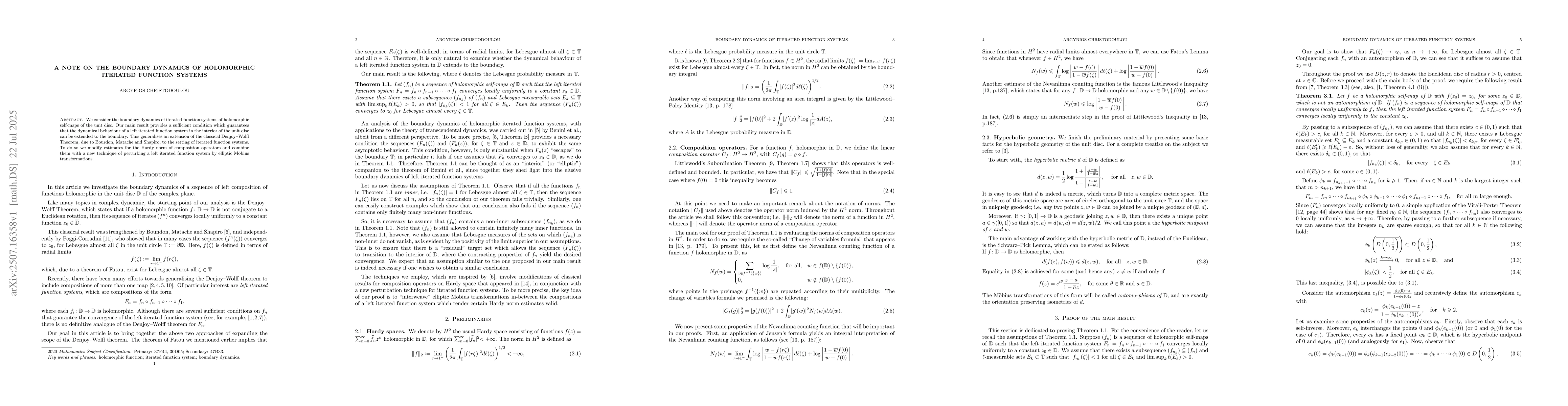 We consider the boundary dynamics of iterated function systems of holomorphic self-maps of the unit disc. Our main result provides a sufficient condition which guarantees that the dynamical behaviour of a left iterated function system in the interior of the unit disc can be extended to the boundary. This generalises an extension of the classical Denjoy--Wolff Theorem, due to Bourdon, Matache and Shapiro, to the setting of iterated function systems. To do so we modify estimates for the Hardy norm of composition operators and combine them with a new technique of perturbing a left iterated function system by elliptic M\"obius transformations.