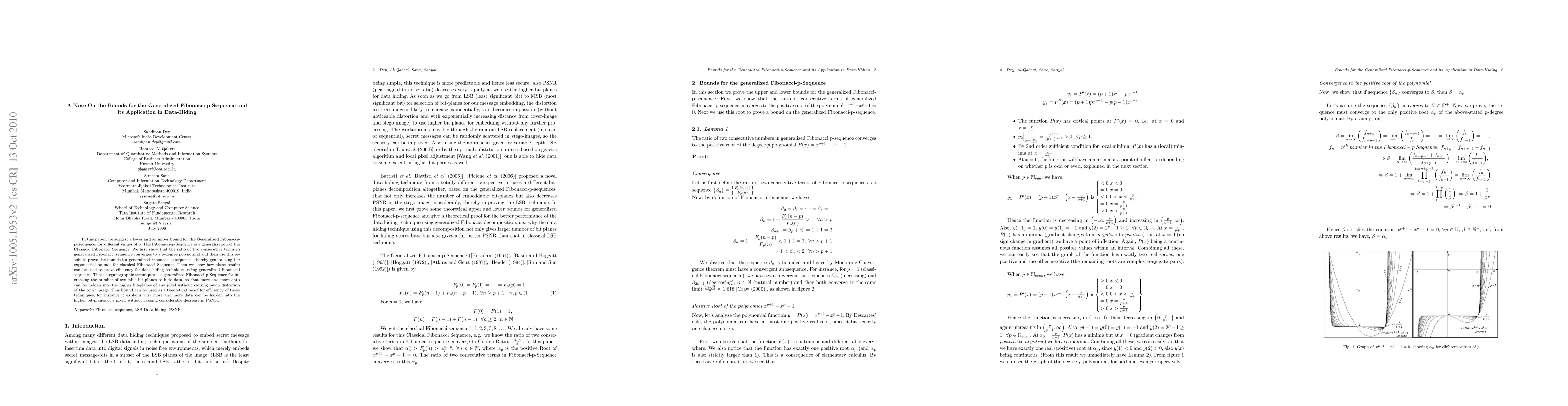 This paper establishes lower and upper bounds for the Generalized Fibonacci-p-Sequence, demonstrating that the ratio of consecutive terms converges to a p-degree polynomial. It then uses this convergence to generalize the exponential bounds for the classical Fibonacci sequence and applies these bounds to enhance data-hiding techniques by utilizing the sequence for efficient data embedding in higher bit-planes without significant distortion.